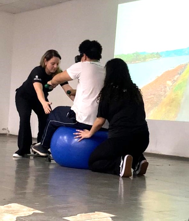 2.Demonstração prática – utilização de óculos de realidade virtual, na qual um voluntário vivenciou um circuito simulado que possibilitou experimentar, de forma imersiva, a aplicação dessa tecnologia em processos de reabilitação e treinamento motor.