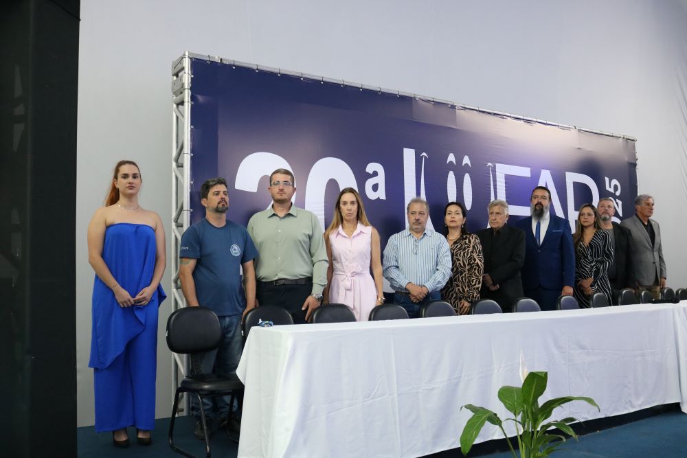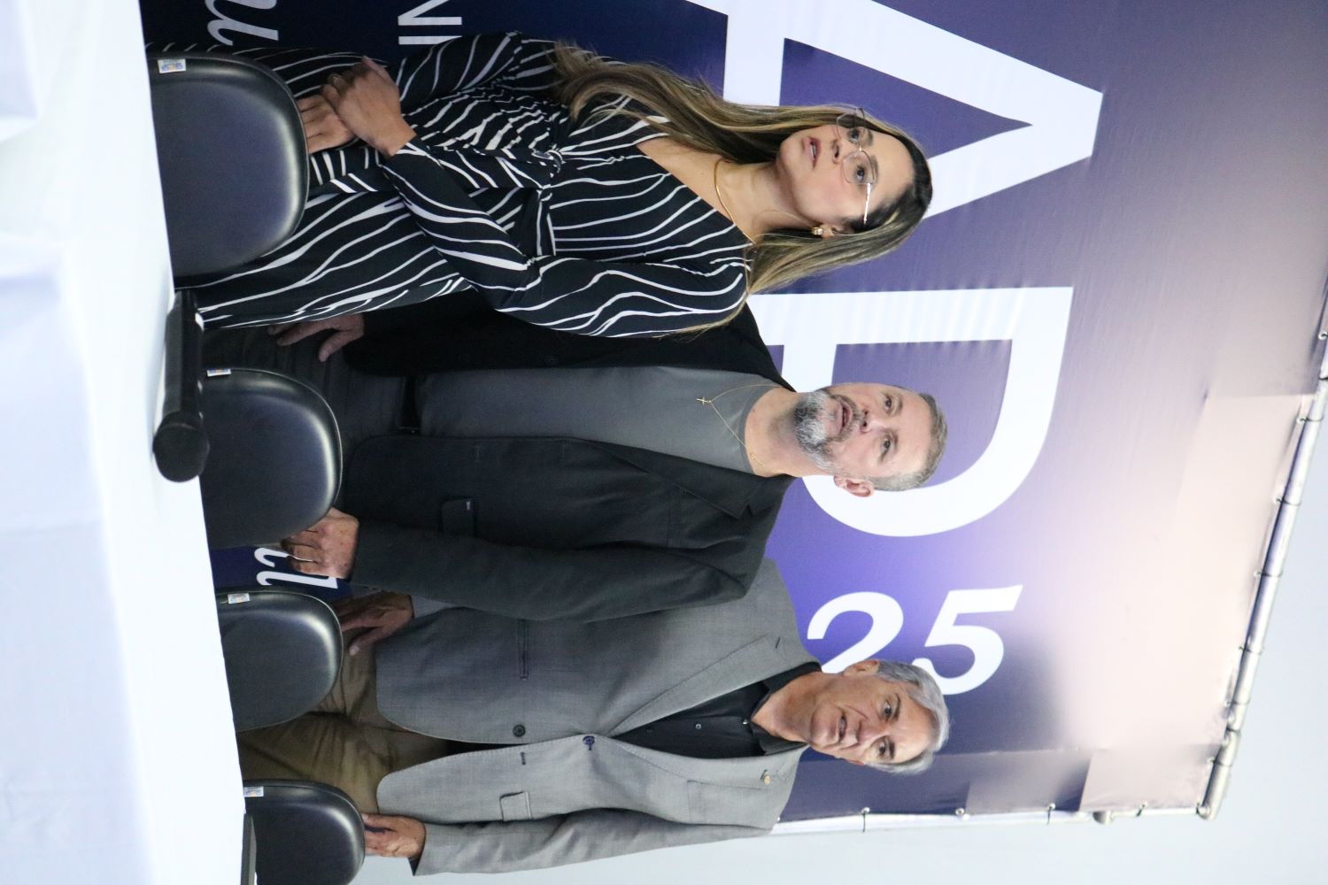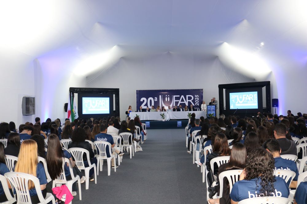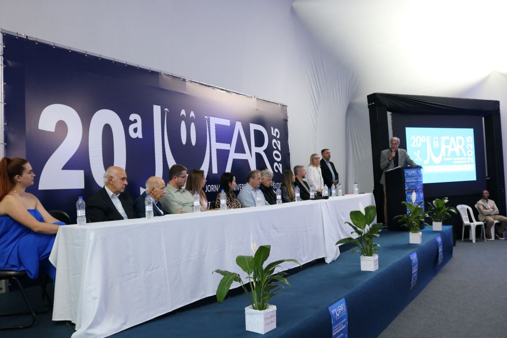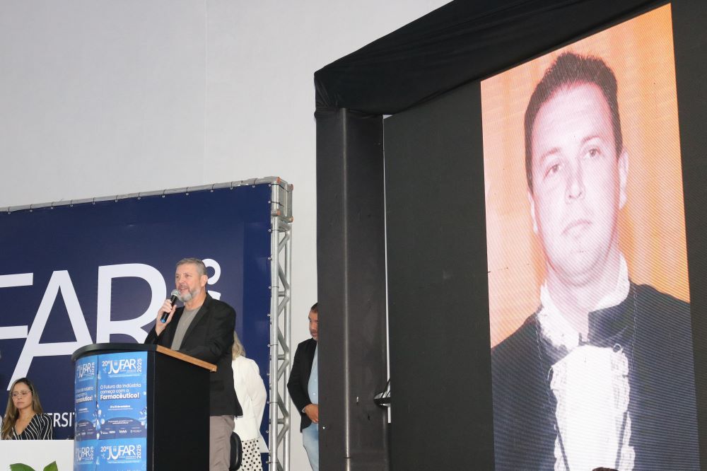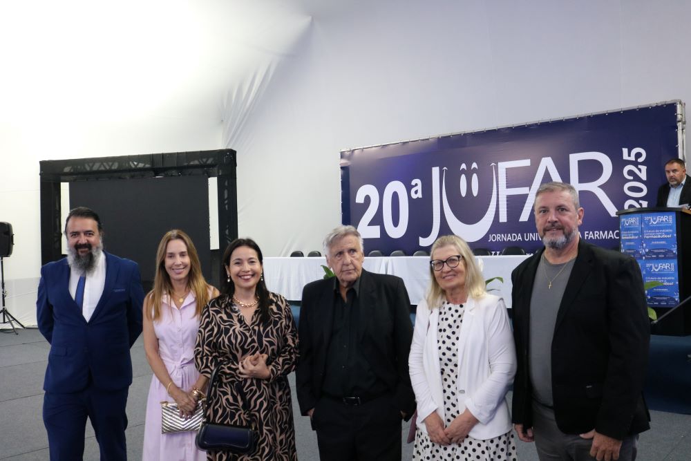 A mesa solene foi composta pelo reitor da Univás, José Dias da Silva Neto; a vice-presidente da Fundação de Ensino Superior do Vale do Sapucaí (FUVS); Daniela Santos Zica Noronha; o diretor executivo da FUVS, Rinaldo Lima de Oliveira; os professores e doutores Honoris Causa da Univás ,Virgínio Cândido Tosta de Souza e Elísio Meirelles de Miranda; a diretora da Unidade Central e pró-reitora de Extensão e Assuntos Comunitários, Silvia Mara Tasso; a pró-reitora de Graduação e Pós-graduação, Joelma Pereira de Faria Nogueira; o coordenador do curso de Farmácia da Univás, Pythagoras de Alencar Olivoti; o diretor do Colégio João Paulo II, Wesley Oppenheimer; o diretor do Colégio Anglo Pouso Alegre, Bruno Dias; a presidente da Comissão Organizadora da 20ª Jufar, acadêmica Giselle de Carvalho Manso; e o homenageado da noite, professor Paulo Henrique Muzetti Valente. “Esse evento representa muito mais do que o encontro acadêmico. Eu penso que é um espaço que integra ensino, ciência, práticas profissionais e, sobretudo, um momento de reflexão sobre o papel transformador que a farmácia exerce para a saúde e para a sociedade. A jornada cumpre esse papel essencial, que é o de conectar, conectar nossos alunos e profissionais, as novas tendências da pesquisa, da tecnologia, das melhores práticas e com isso fortalecemos o compromisso com a dedicação, a segurança e o cuidado. Então a FUVS, se orgulha muito por abrigar esse tipo de iniciativa que reforça ainda mais a nossa missão, que é formar profissionais extremamente capacitados, sobretudo os profissionais éticos e profissionais que estejam sensíveis às necessidades humanas”, ressaltou a vice-presidente da FUVS; Daniela Santos Zica Noronha.