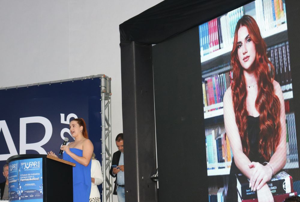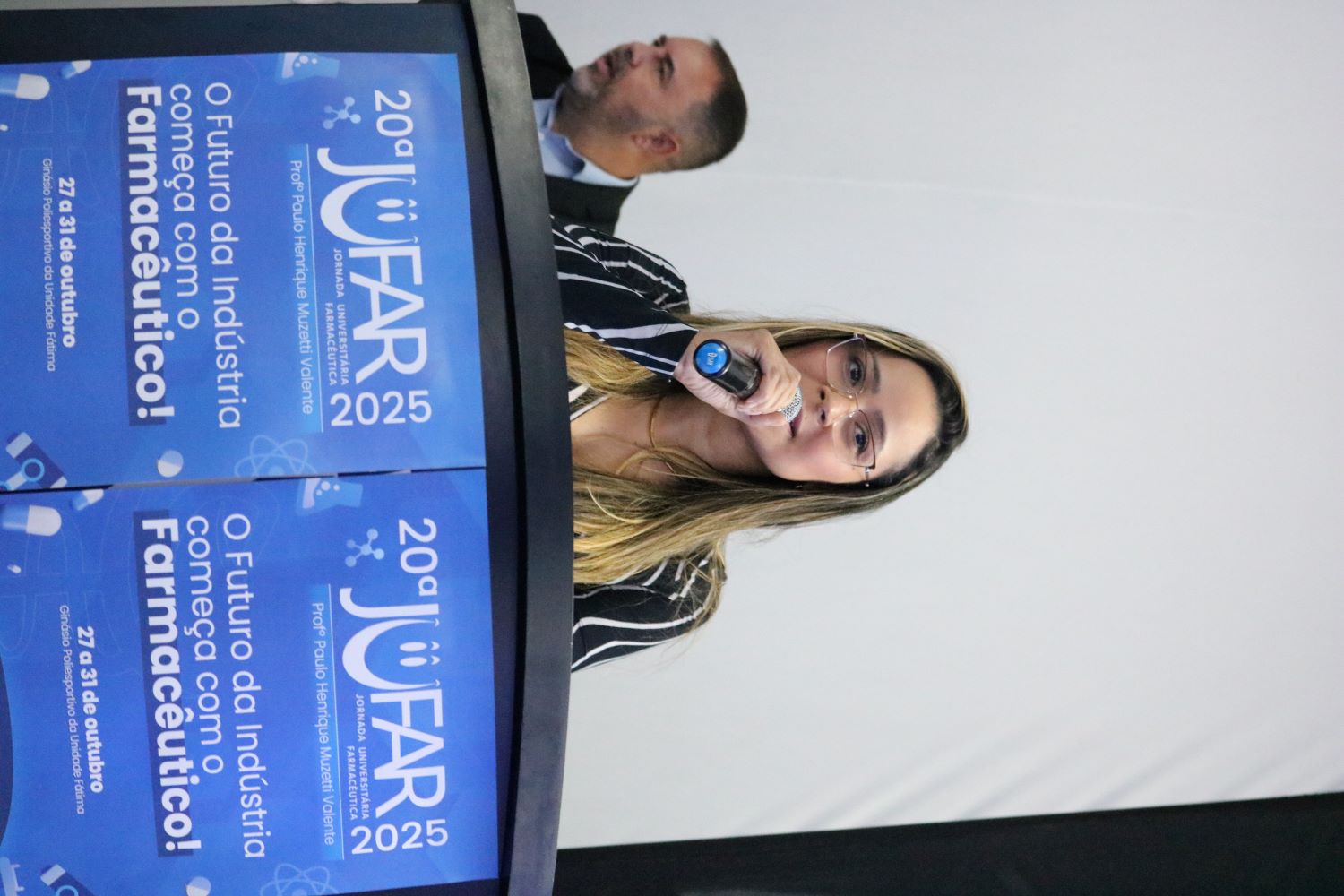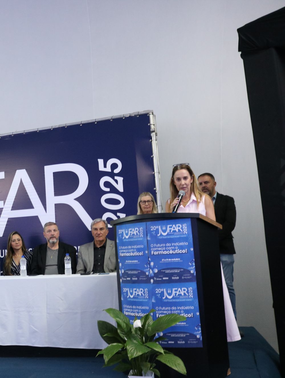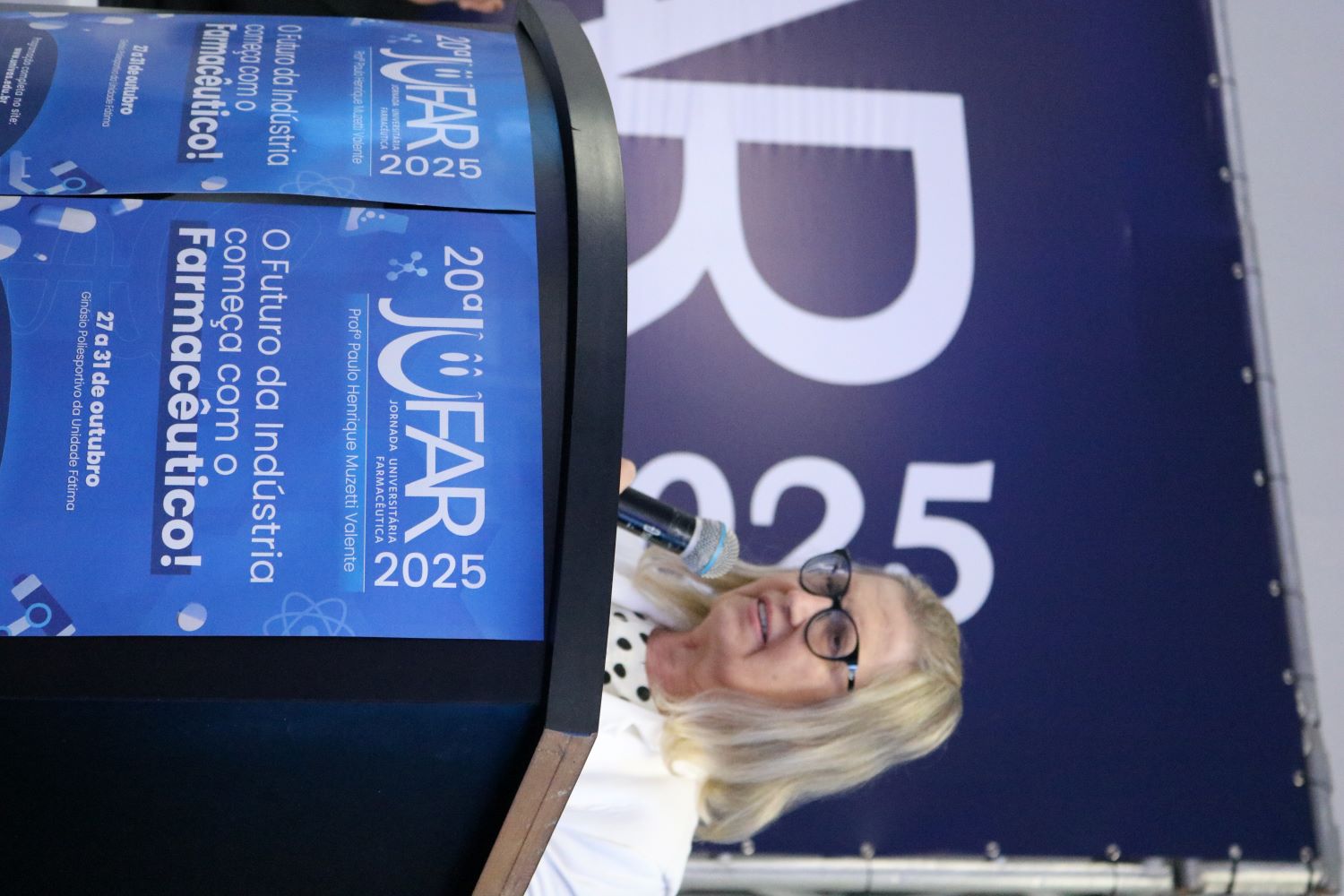 A cerimonialista e professora Ana Lúcia Bertoncin (“O coração da JUFAR”) falou da alegria de celebrar a 20º Jornada Farmacêutica. “Vinte edições que contam uma história de aprendizado, de dedicação e de amor à profissão. O tema deste ano traduz o espírito de quem acredita na ciência como caminho de transformação e na ética como base de cada conquista. A indústria farmacêutica tem papel essencial nessa caminhada. É nela que o conhecimento técnico encontra a prática, que a pesquisa se transforma em produto e que o cuidado com a saúde ganha forma e alcance. A presença do farmacêutico na indústria representa o compromisso com a qualidade, a inovação e sobretudo, com a vida. É um espaço de desafios e descobertas, onde cada decisão reflete responsabilidade e paixão pelo que fazemos”, refletiu.