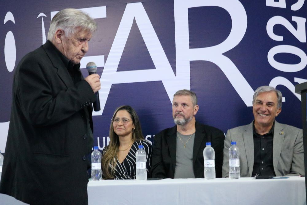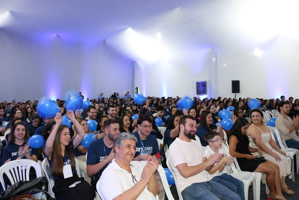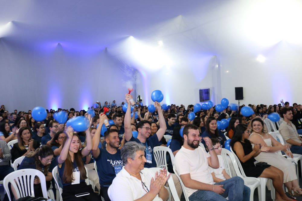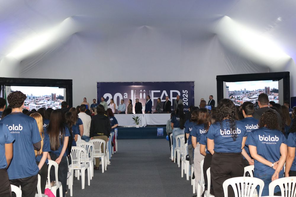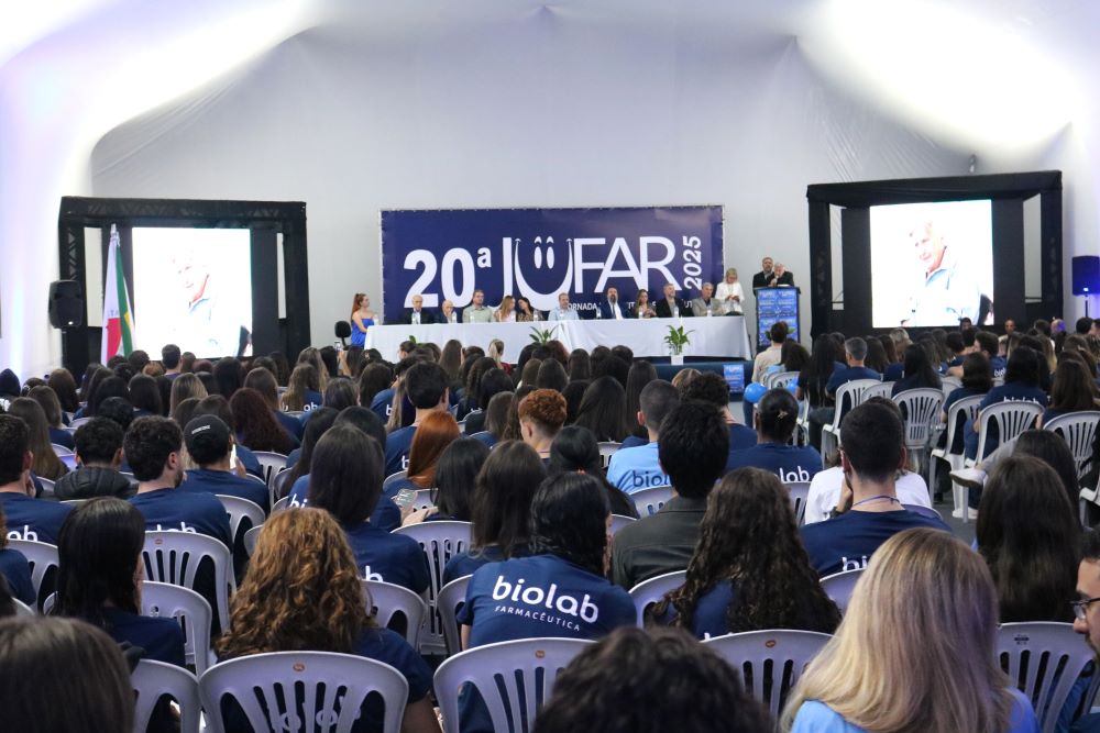 Uma noite inesquecível com muitas presenças ilustres e cercada de muita alegria e gratidão. Assim foi a cerimônia de abertura da 20ª Jornada Universitária Farmacêutica (Jufar 2025) que neste ano faz homenagem especial ao professor Paulo Henrique Muzetti Valente. O evento acadêmico promovido pelo curso de Farmácia da Univás reuniu educadores, alunos e convidados no Ginásio Poliesportivo da Unidade Fátima na noite desta segunda-feira, dia 27 de outubro.
