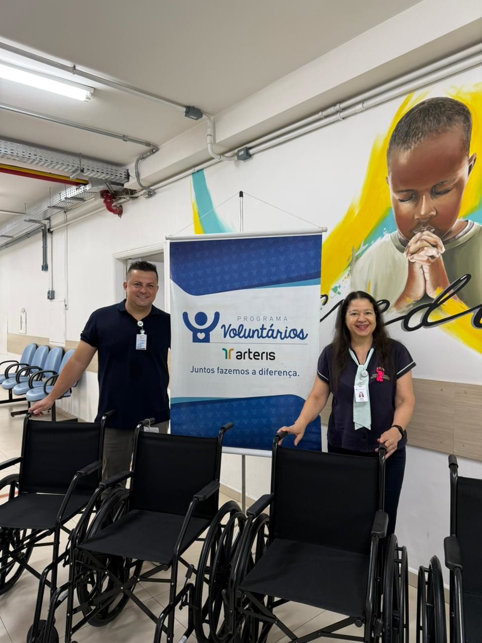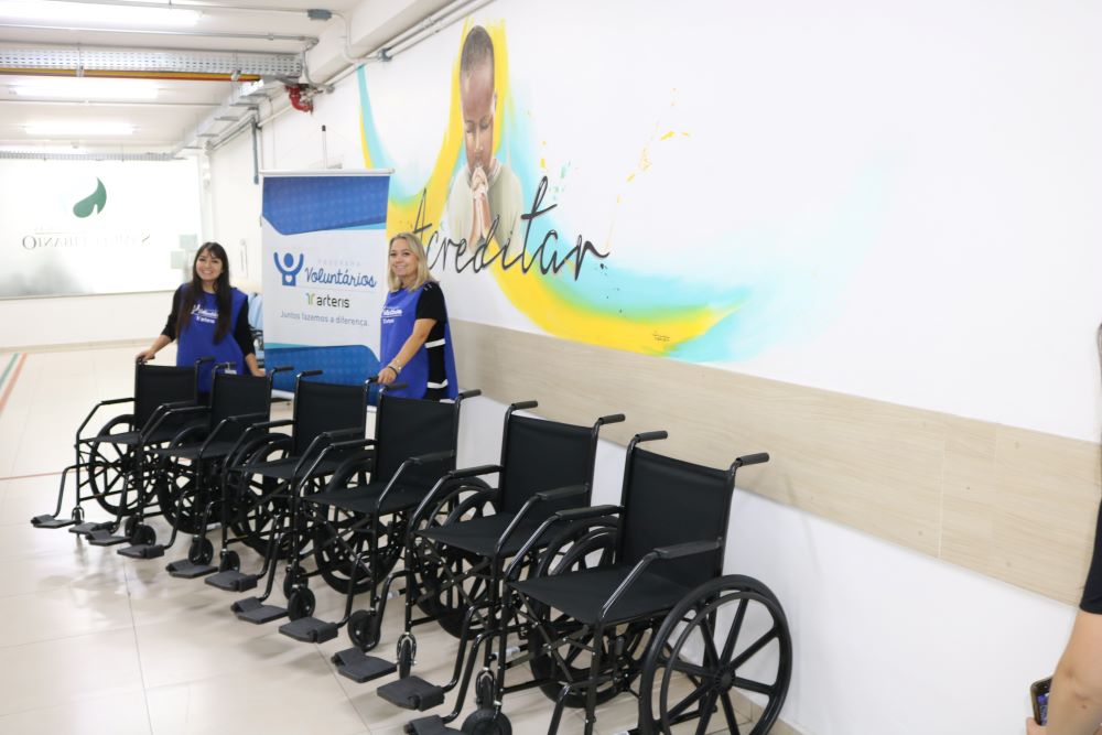 As cadeiras foram entregues por uma das líderes dos voluntários da Arteris Fernão Dias, analista de Sustentabilidade Ana Carolina do Prado, e recebidas pela assistente administrativa, Ana Rosa de Jesus Alves.