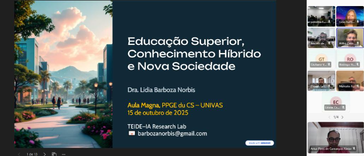 O Programa de Pós-graduação em Educação, Conhecimento e Sociedade (PPGEduCS) da Universidade do Vale do Sapucaí (Univas) recebeu, no dia 15 de outubro, a Profª. Drª. Lidia Barboza Norbis para ministrar a Aula Magna do 2º semestre de 2025. O tema do evento foi “Educação Superior, Conhecimento Híbrido e Nova Sociedade”. O evento foi organizado pelo Núcleo de Pesquisa em Educação, Conhecimento e Sociedade (Nupecs) da Univás.