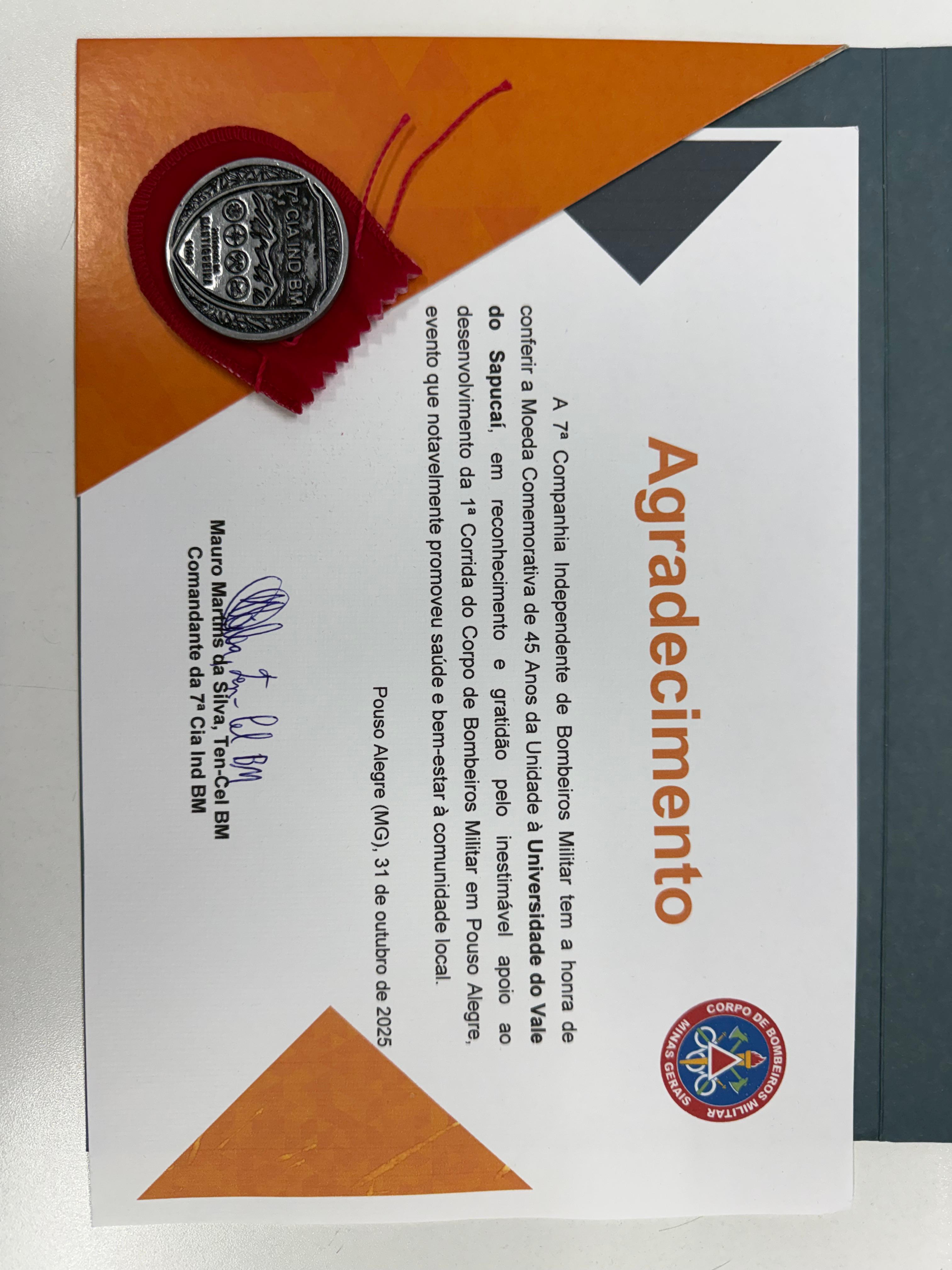 A homenagem ocorreu durante a solenidade de aniversário de 45 anos de Instalação do Corpo de Bombeiros Militar de MG em Pouso Alegre, quando foi realizada a entrega de uma moeda comemorativa da unidade, como forma de agradecimento e reconhecimento institucional à Univás.