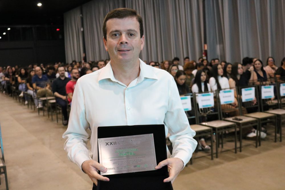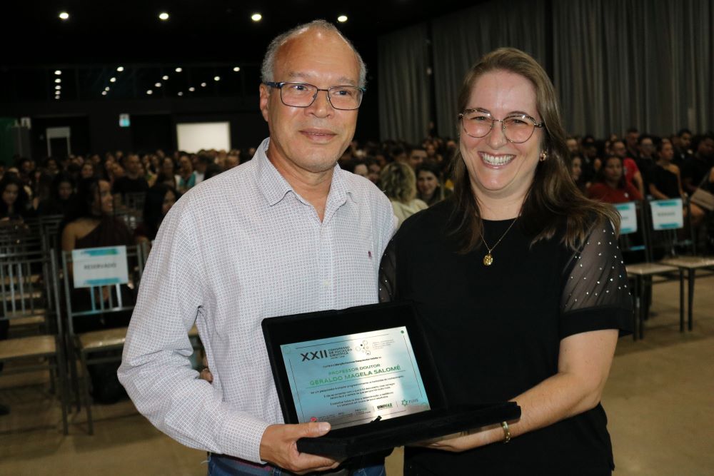 O professores Geraldo Magela Salomé da Univás e Fabiano Valias do Instituto Nacional de Telecomunicações (INATEL) receberam menções honrosas durante o evento acadêmico.
