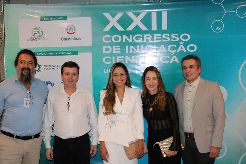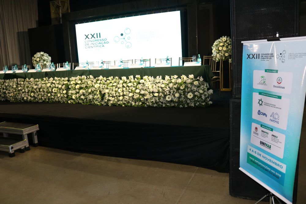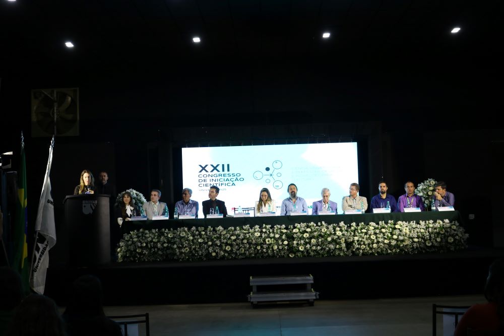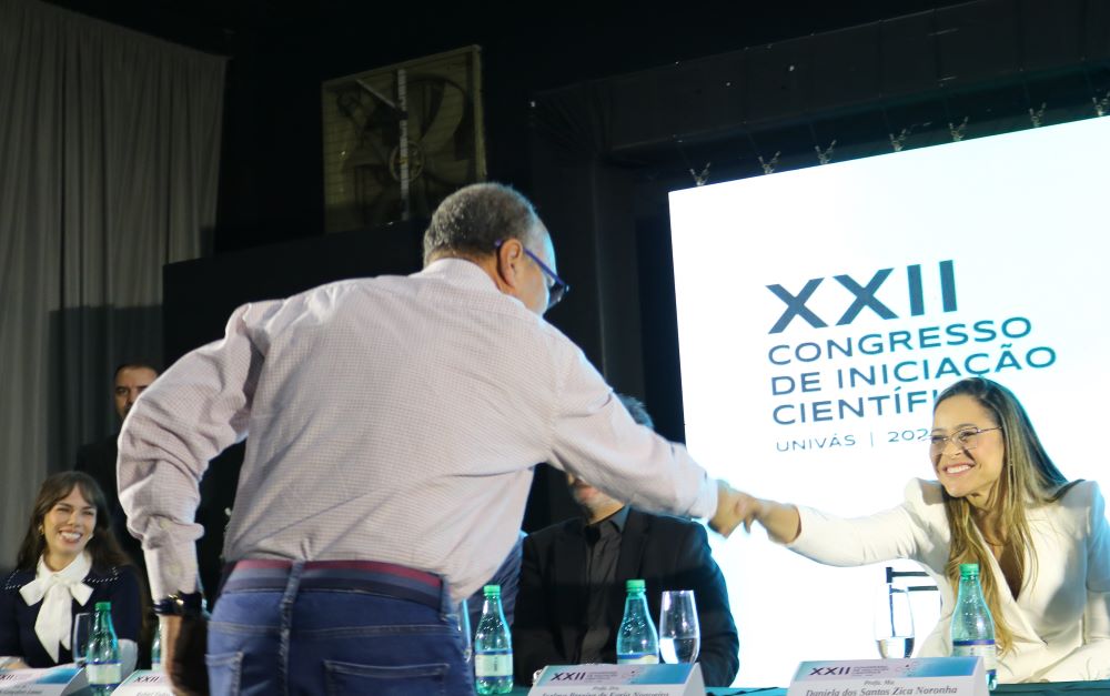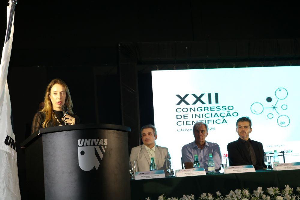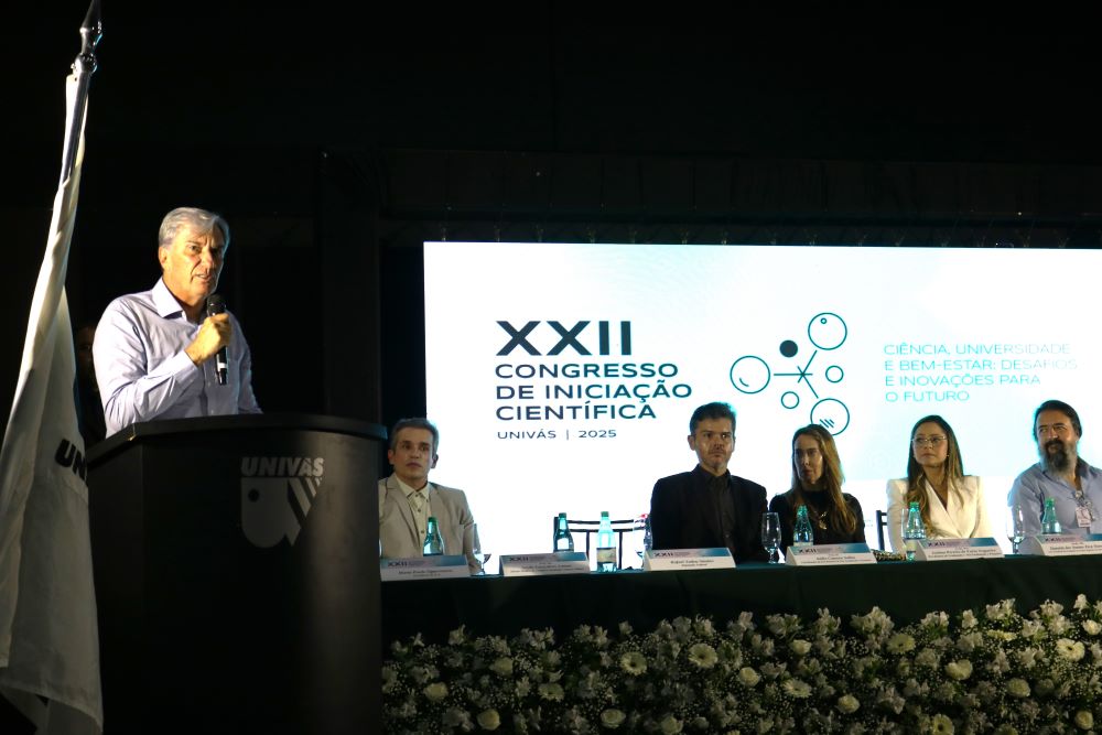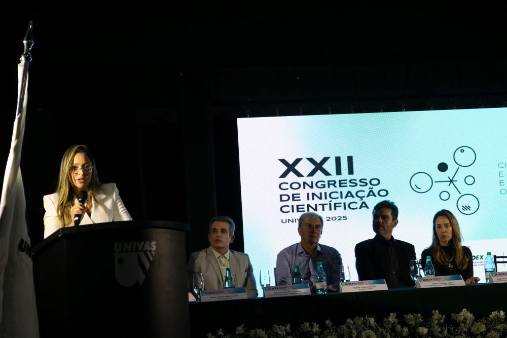 A mesa solene foi composta pelo reitor da Univás, José Dias da Silva Neto; o vice-reitor, Taylor Brandão Schnaider; o Deputado Federal, Rafael Simões; a vice-presidente da Fundação de Ensino Superior do Vale do Sapucaí (FUVS), Daniela dos Santos Zica Noronha; a pró-reitora de Pós-Graduação e Pesquisa e Pró-Reitora de Graduação, Joelma Pereira de Faria Nogueira; o diretor do Colégio João Paulo II (CJPII), Wesley Openheimer de Carvalho; o coordenador do Programa de Pós-graduação em Educação, Conhecimento e Sociedade, Atilio Catosso Salles; o coordenador de Pesquisa da Unidade Central, Ricardo da Silva Alves; o coordenador de Pesquisa da Unidade Fátima, Rodrigo Machado Pereira; diretor técnico do Complexo Hospitalar Samuel Libânio (CHSL), Saulo Gonçalves Lamas; e o diretor do Colégio Anglo, Bruno Dias Ferreira. “É com imensa alegria, que representando a Fundação do Ensino Superior do Vale com Sapucaí, vivencio esse momento de celebrar a curiosidade, celebrar a pesquisa e celebrar, sobretudo, o desejo genuíno de transformar o mundo por meio do conhecimento. Vemos nesse congresso jovens cientistas dando seus primeiros passos rumo a uma jornada de descobertas, ética e muito compromisso social. Parabéns a todos os alunos, professores e orientadores, e eu desejo que esse congresso seja de equilíbrio inspirador, produtivo e acima de equilíbrio humano”, declarou a vice-presidente da FUVS, Daniela Zica.