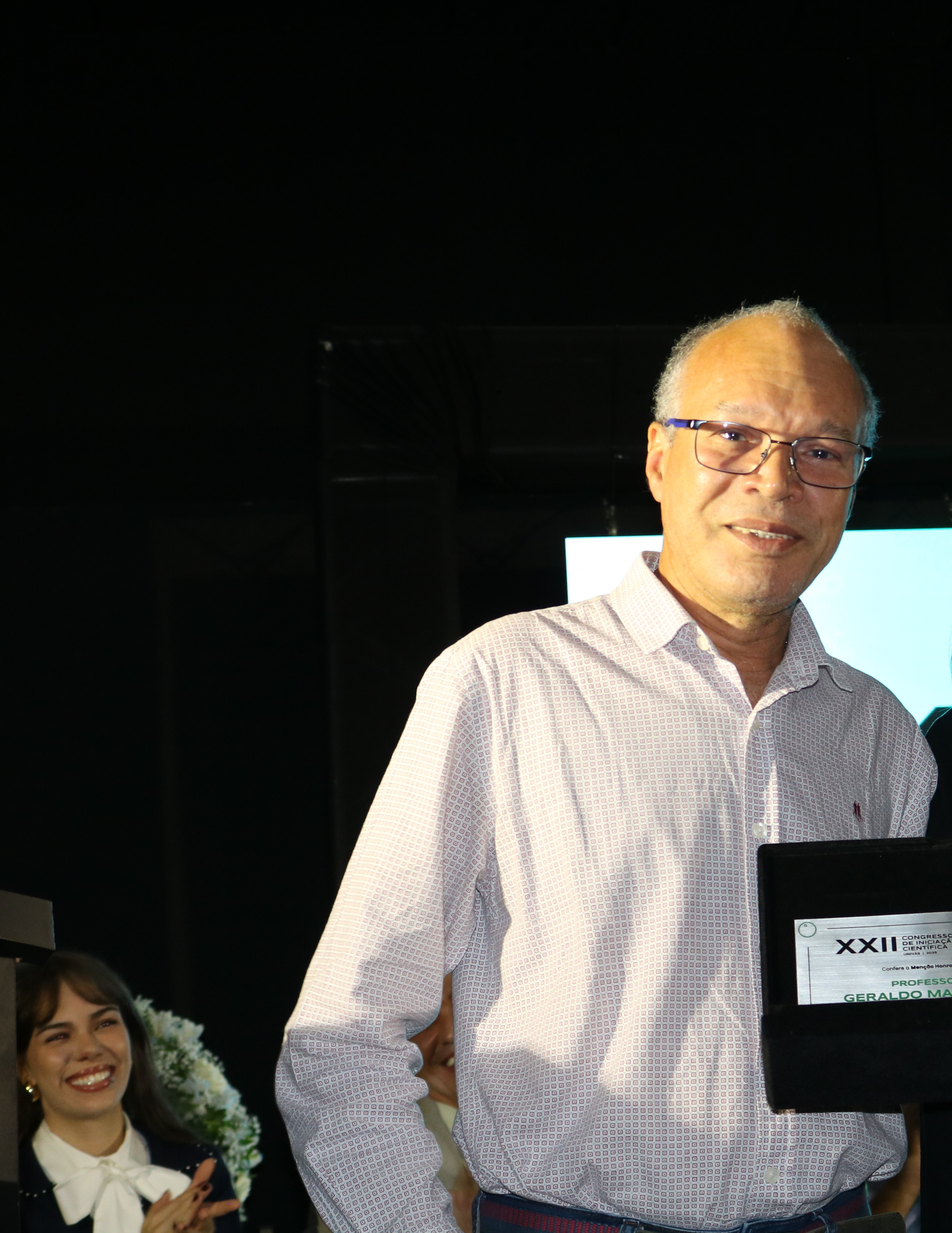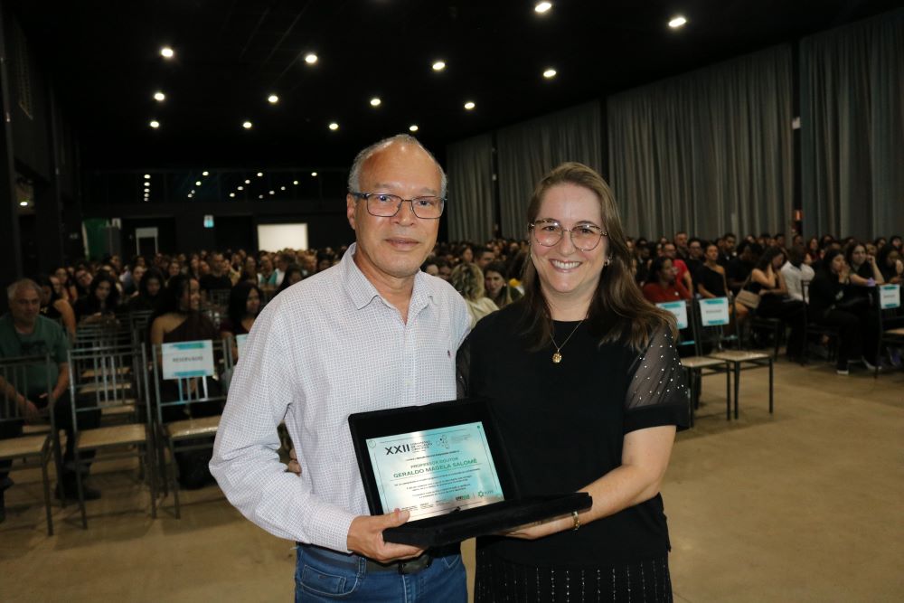 Geraldo recebeu a homenagem das mãos da coordenadora do Programa de Pós-graduação Profissional em Ciências a Aplicadas à Saúde (PPGPCAS), Adriana Rodrigues dos Anjos Mendonça. “Trabalhar com pesquisa e educação na área da saúde é uma missão que carrego com muito orgulho e responsabilidade. A pesquisa permite investigar, inovar e propor soluções que impactam diretamente a qualidade de vida das pessoas. Já a educação é o alicerce para formar profissionais conscientes, éticos e preparados para os desafios do cuidado. Unir essas duas dimensões é contribuir para um sistema de saúde mais eficiente, humano e baseado em evidências científicas. Cada projeto, cada aula e cada orientação representam uma oportunidade de transformar realidades e fortalecer o compromisso com a vida”, conta o homenageado.