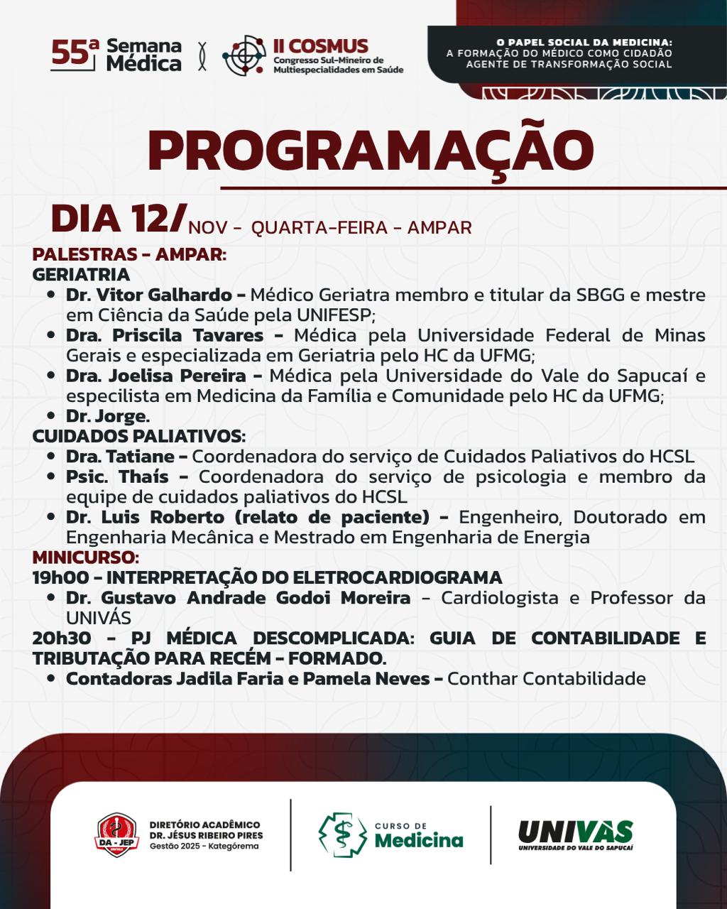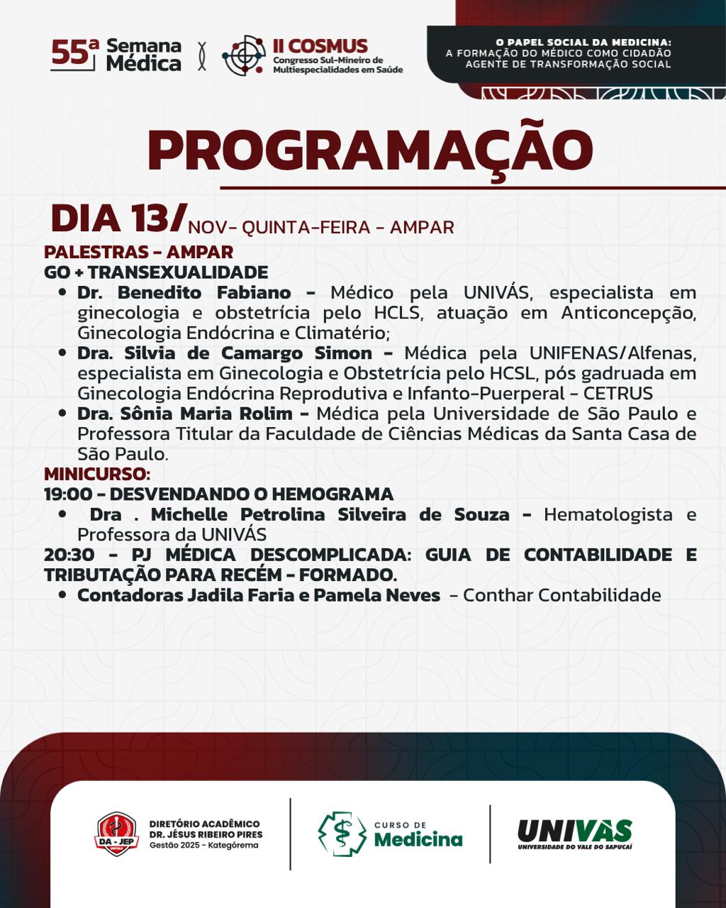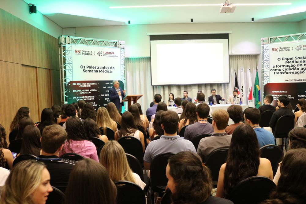 A 55ª edição da Semana Médica e 2ª edição do Congresso Sul-Mineiro de Multiespecialidades em Saúde (COSMUS) está sendo realizada de 10 a 14 de novembro na sede da Associação Médica de Pouso Alegre e Região (AMPAR) e na Unidade Central da Univás. “Agradeço aos professores pela presença e por prestigiar essa semana médica conosco. Quero também agradecer aos amigos, organizadores, professores, orientadores, coordenadores e pró-reitores que estiveram conosco nesse processo de organizar esse evento. Toda a gestão é plenamente grata a vocês que nos auxiliaram, orientaram e acolheram durante os árduos meses tentando construir um evento lindo, significativo e proveitoso”, disse a presidente do Diretório Acadêmico (DA Medicina), acadêmica Maria Paula Oppermann.