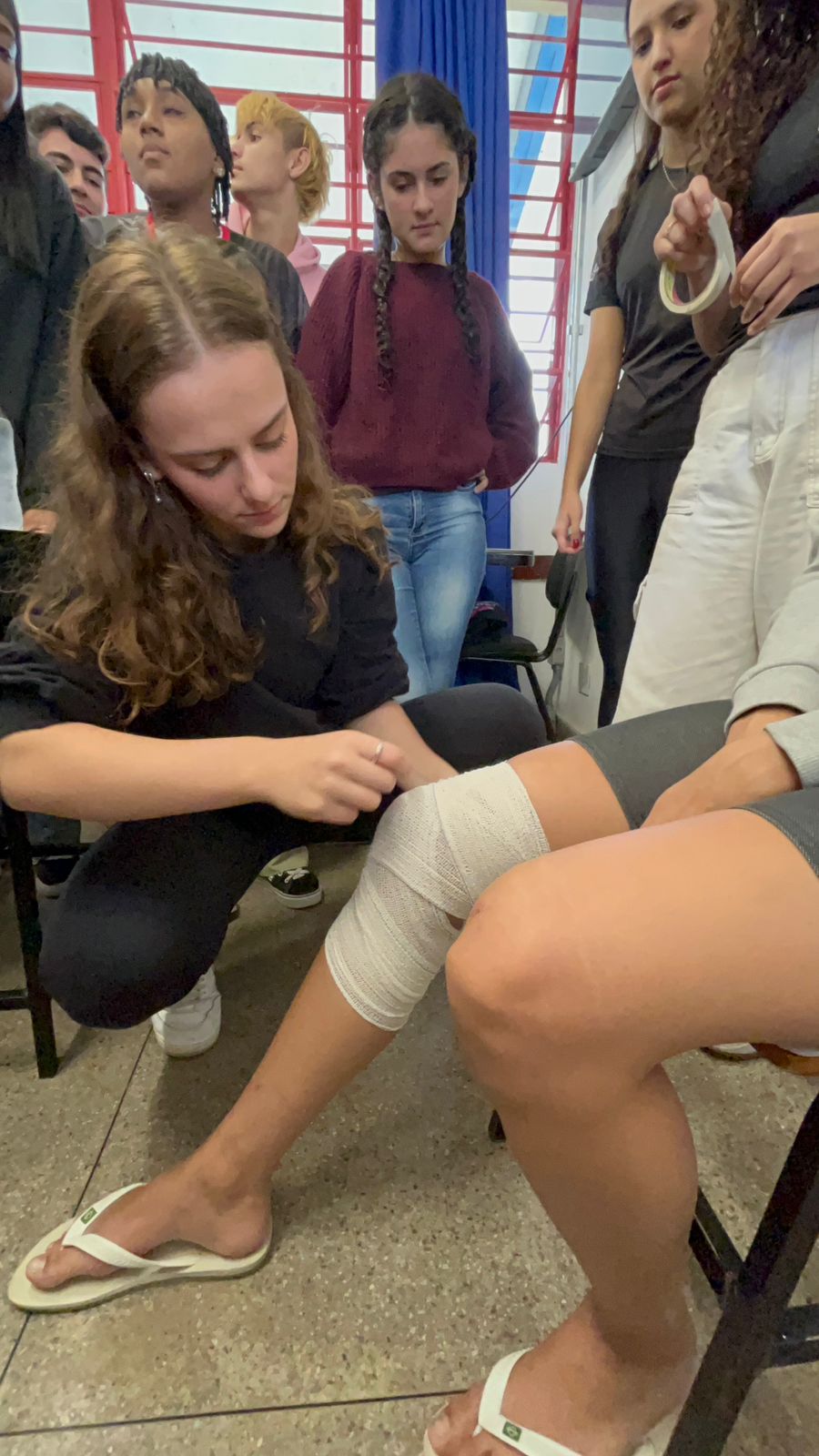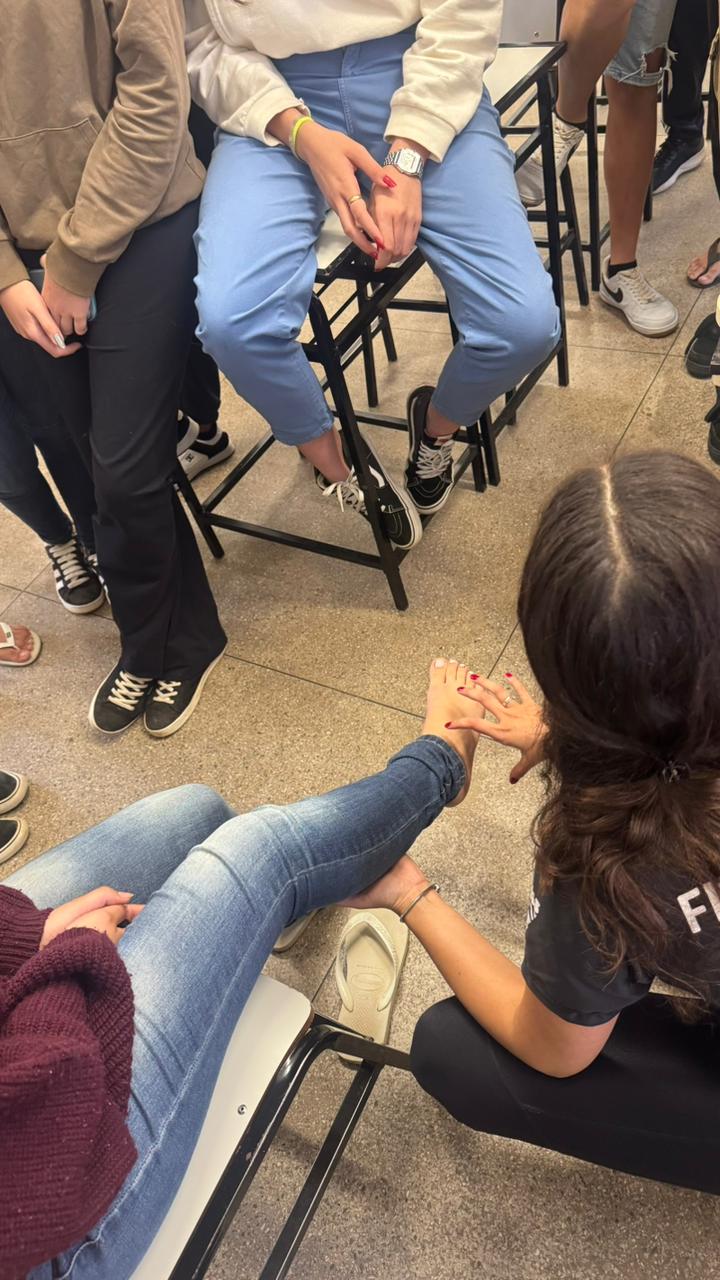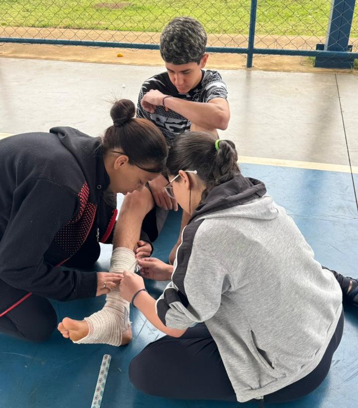 Na sequência, os estudantes participaram de uma gincana educativa, com simulações de entorses, fraturas e luxações, seguida de um formulário avaliativo com o propósito de identificar o nível de conhecimento prévio dos participantes sobre situações de emergência esportiva e compreender suas possíveis experiências anteriores.