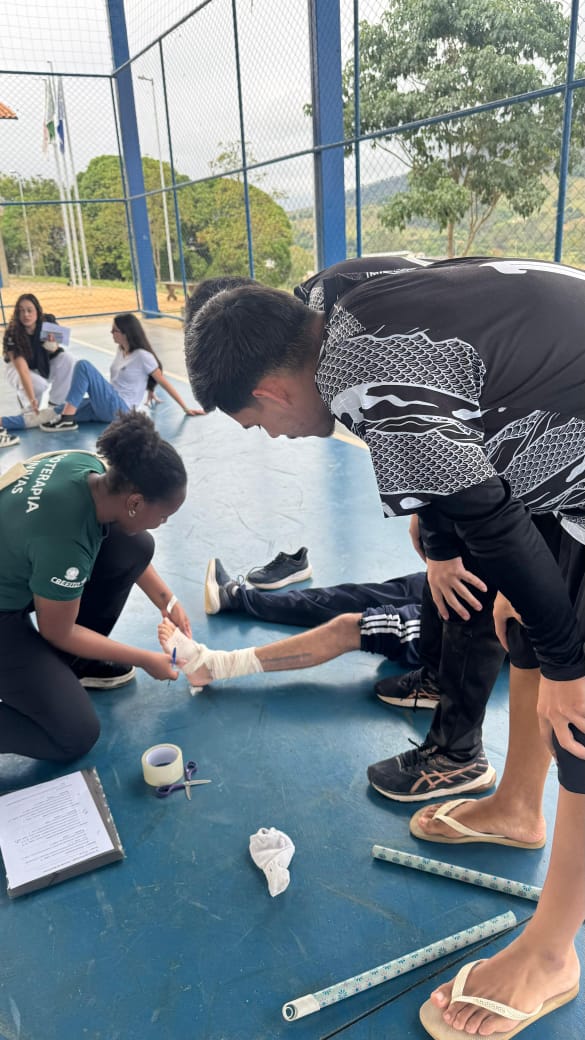 Os alunos do 4º período do curso de Fisioterapia da Univás realizaram uma atividade na Escola Estadual Cônego Jose Eugenio de Faria, em Cachoeira de Minas, com o intuito de conscientizar jovens esportistas sobre a importância dos primeiros socorros em emergências. “O projeto buscou demonstrar a importância de conhecimento de técnicas de primeiros socorros no contexto esportivo e, assim, incentivar jovens a buscarem uma conduta adequada em situações de emergência”, disse o coordenador do curso de Fisioterapia, Diego Openheimer.