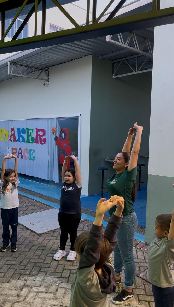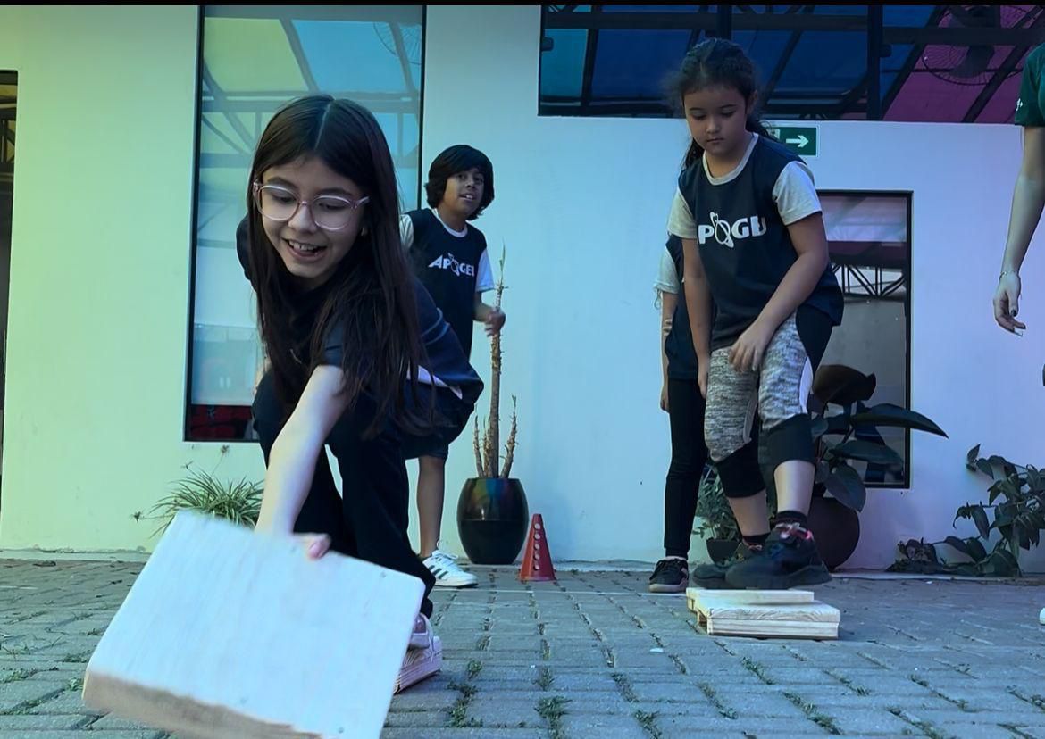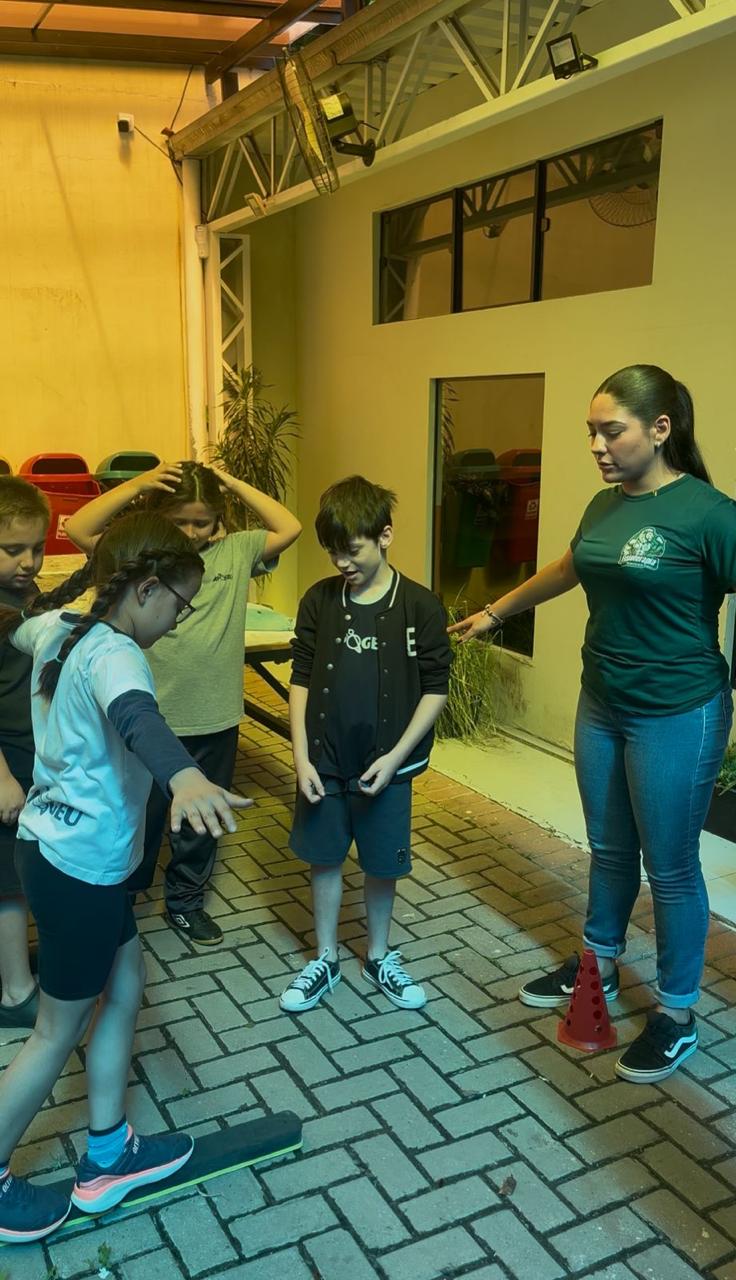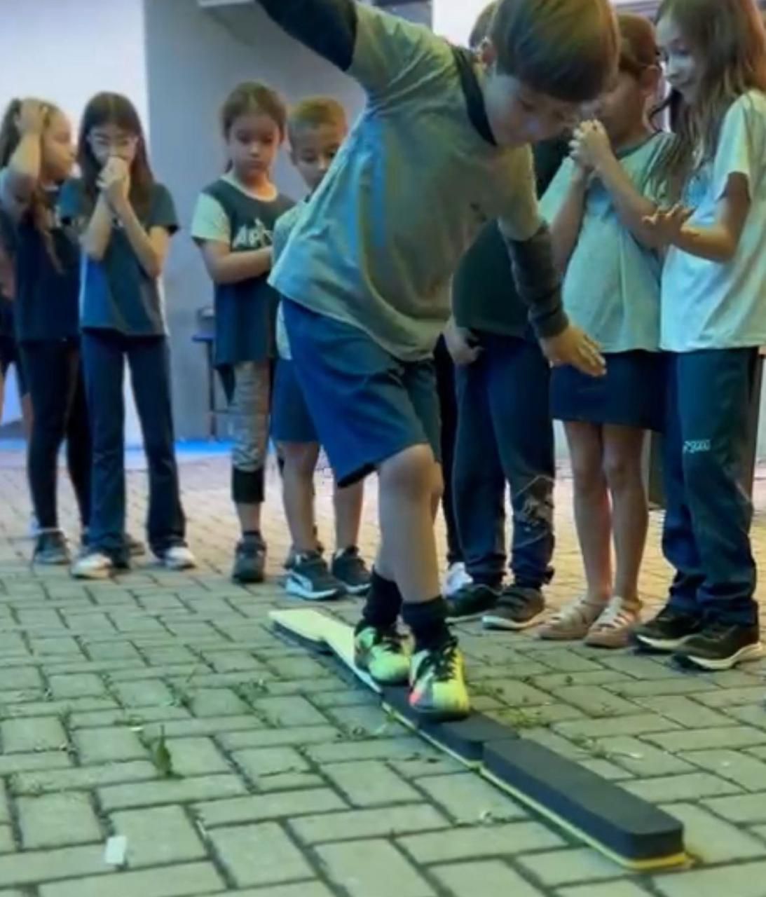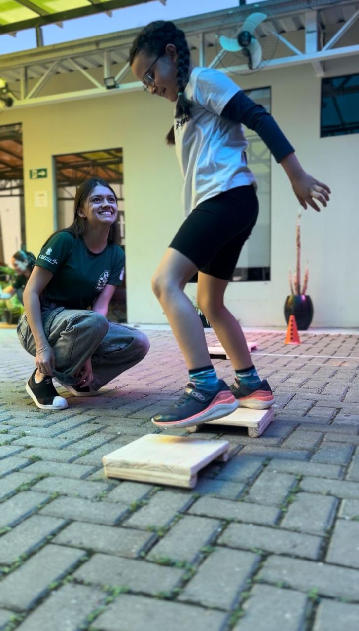 As crianças participaram de atividades como equilíbrio para trás, saltos laterais e monopedais, transferência lateral, além de um circuito lúdico com corrida de saco e bola ao alvo. Todas as práticas foram pensadas para promover movimento, participação e diversão, enquanto ajudavam no fortalecimento das habilidades motoras importantes nessa fase da infância.