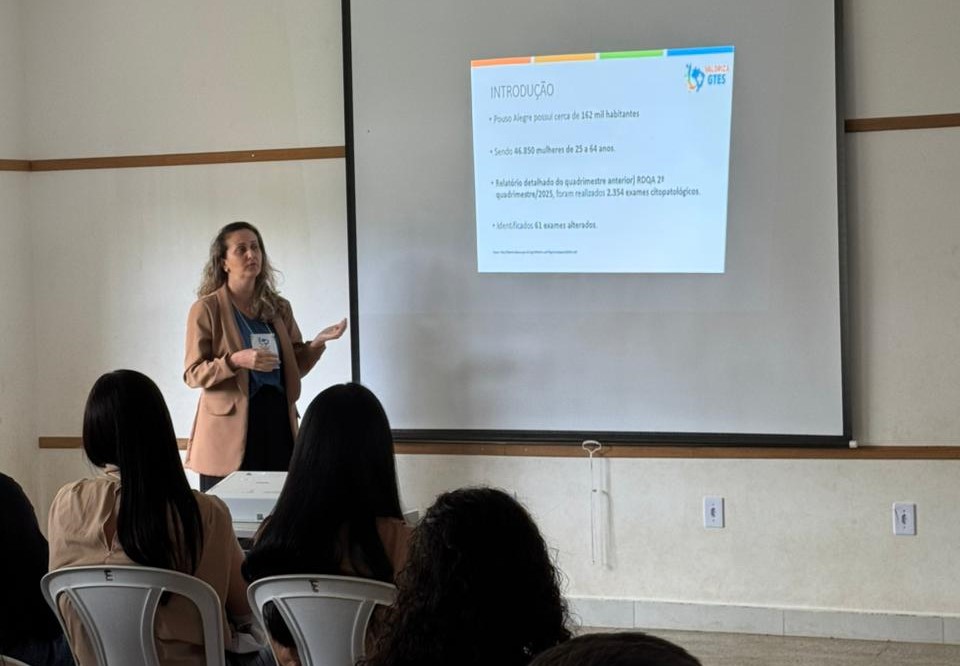 Entre as experiências apresentadas, a professora Lívia também se destacou compartilhando um projeto desenvolvido no âmbito de seu trabalho à frente da saúde da mulher do município de Pouso Alegre, evidenciando avanços, estratégias e impactos positivos dessa ação no território.