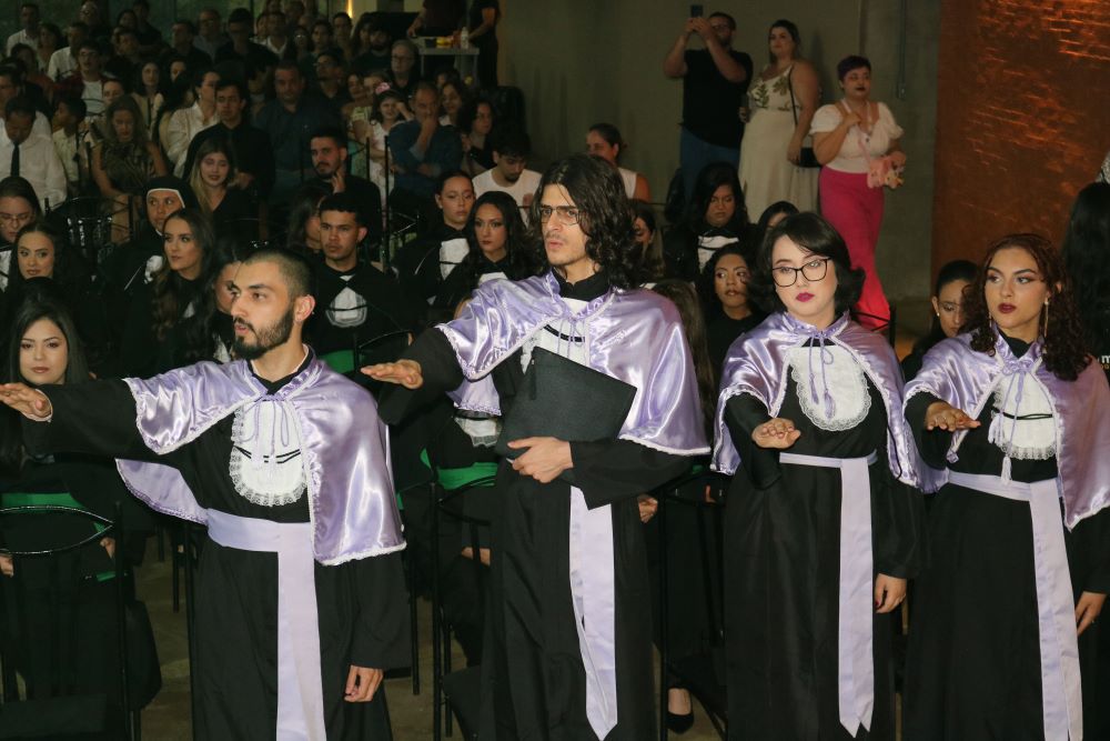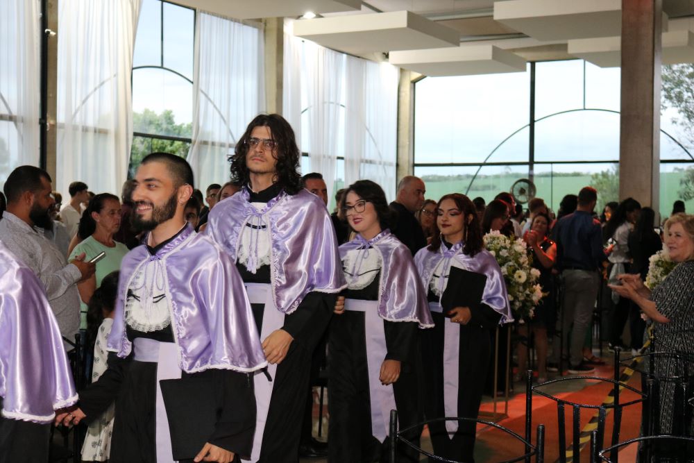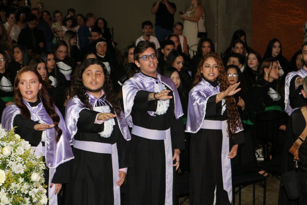 O formando Kawan Gabriel Fernandes Pereira, em nome da turma de Letras, proferiu o juramento com a mão direita levantada. “Consciente de minha responsabilidade como profissional de Letras, comprometo-me a exercer minhas atividades com dignidade, contribuindo para a cidadania, disseminação do conhecimento e promoção da cultura. Assim, prometo”