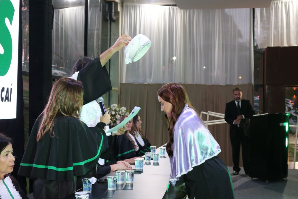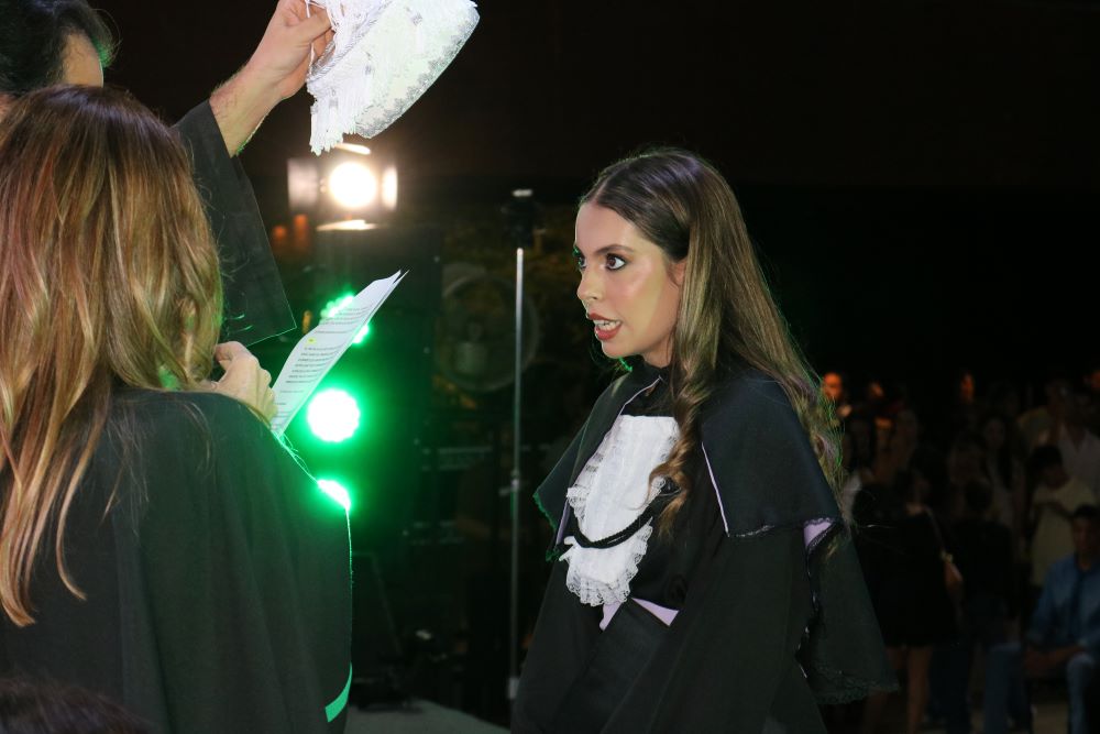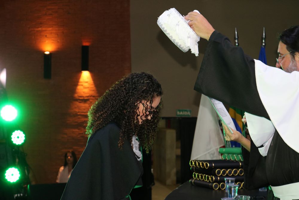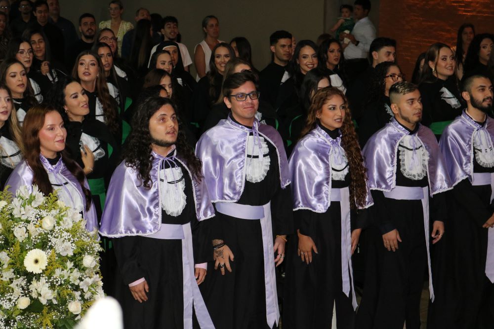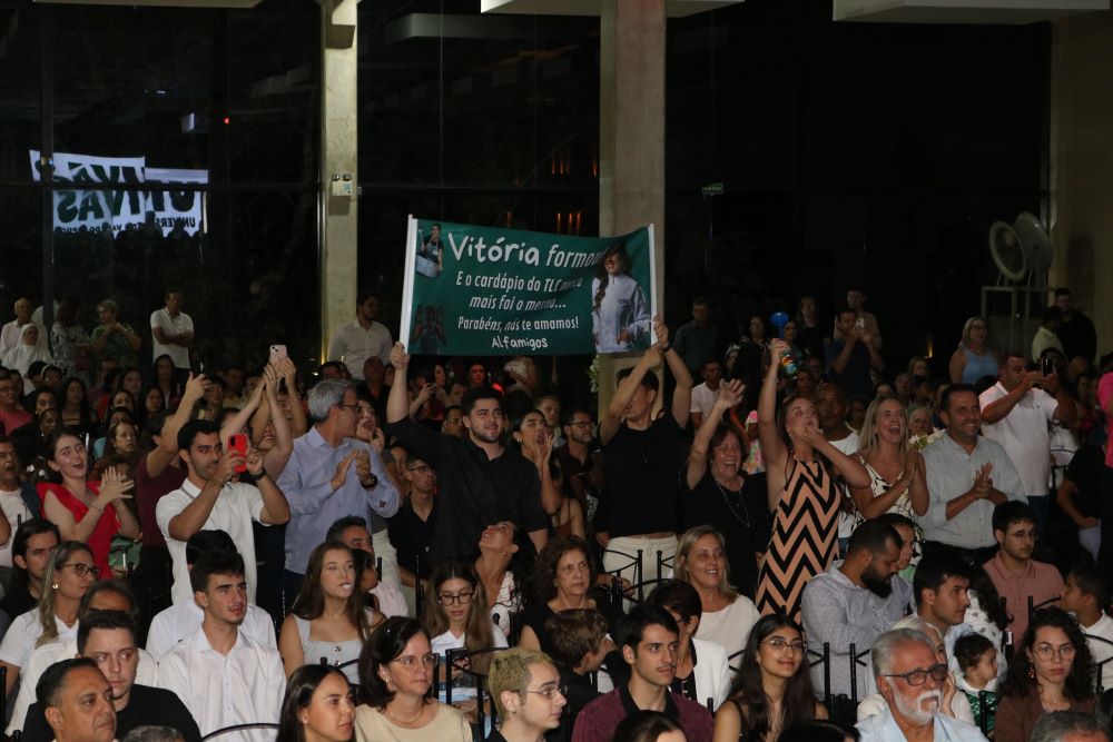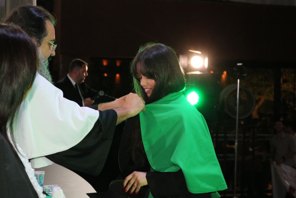 A formanda de Nutrição, Maria Vitória Fernandes da Silveira, proferiu o juramento em nome da turma e juntamente com os demais formandos. “Prometo que, ao exercer a profissão de nutricionista, o farei com dignidade e eficiência, valendo-me da ciência da nutrição, em benefício da saúde da pessoa, sem discriminação de qualquer natureza. Prometo, ainda, que serei fiel aos princípios da moral e da ética. Ao cumprir este juramento com dedicação, desejo ser merecedor dos louros que a profissão proporciona. Assim, prometo”.