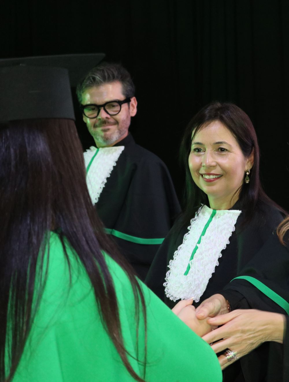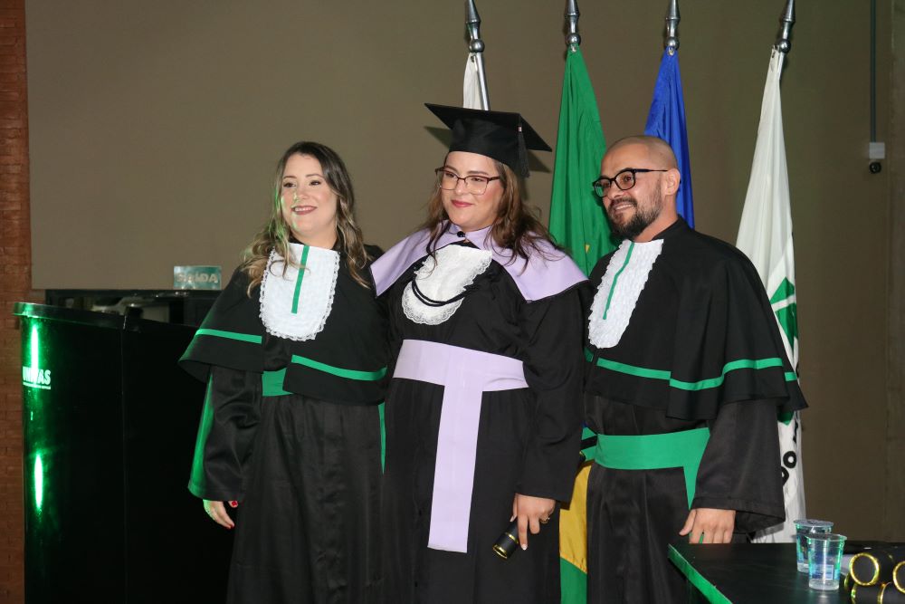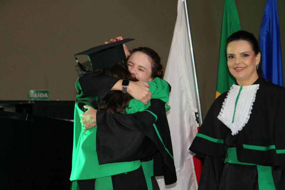 A formanda Cléo de Paula Barberis, representando os demais formandos do curso de Nutrição, recebeu das mãos do reitor o Grau Acadêmico de Nutricionista.