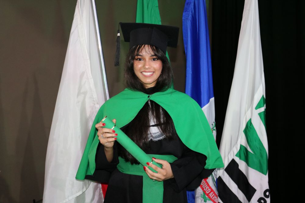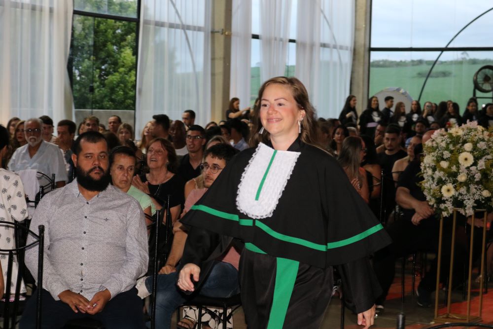 A formanda do curso de Farmácia da Univás, Rayara Martins Almeida Xavier, recebeu excepcionalmente a outorga de grau, fez o juramente, e participou da formatura.