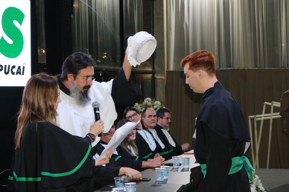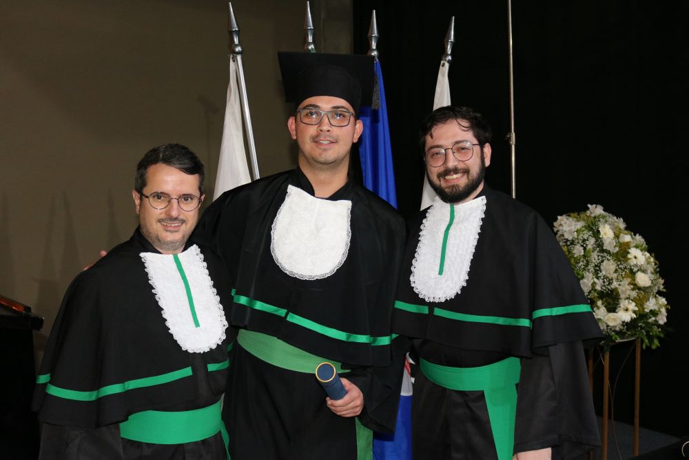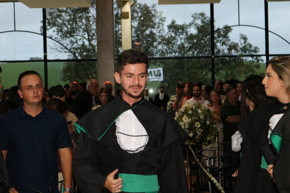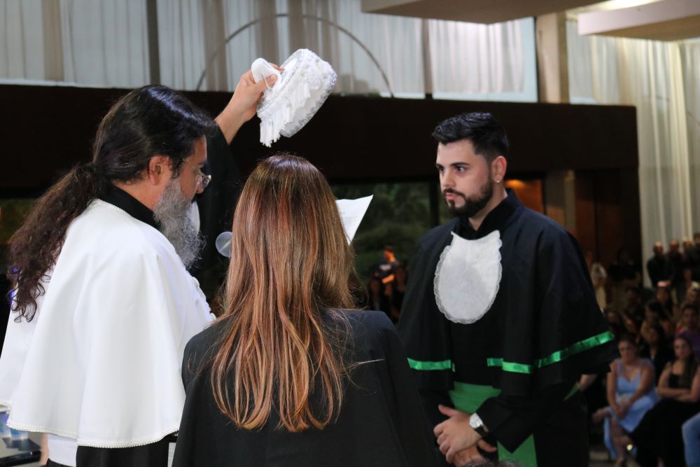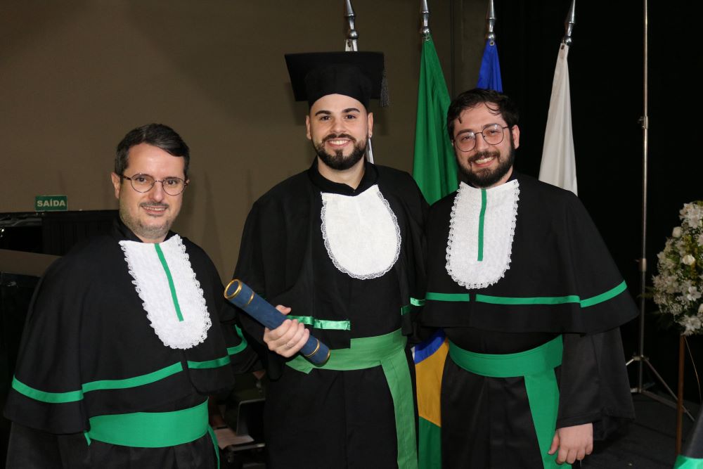 O formando Lucca de Almeida Rebello Toledo, representando os demais formandos do curso de Sistemas de Informação, recebeu das mãos do reitor o Grau Acadêmico. Em seguida, os formandos receberam os cumprimentos da mesa solene e posaram para as fotos individuais.