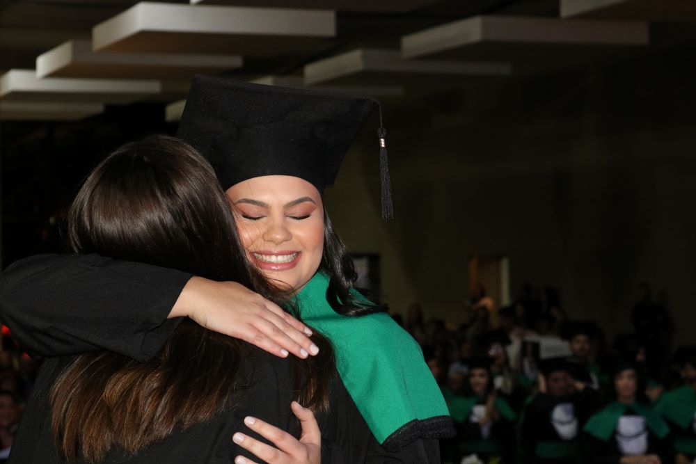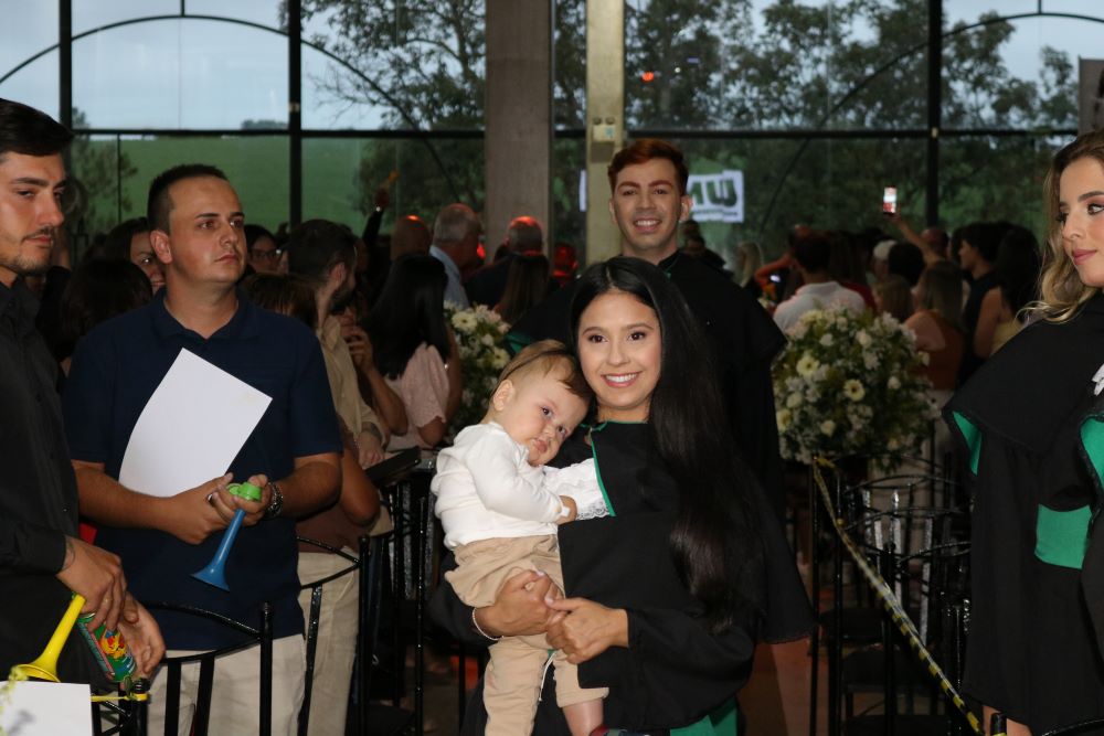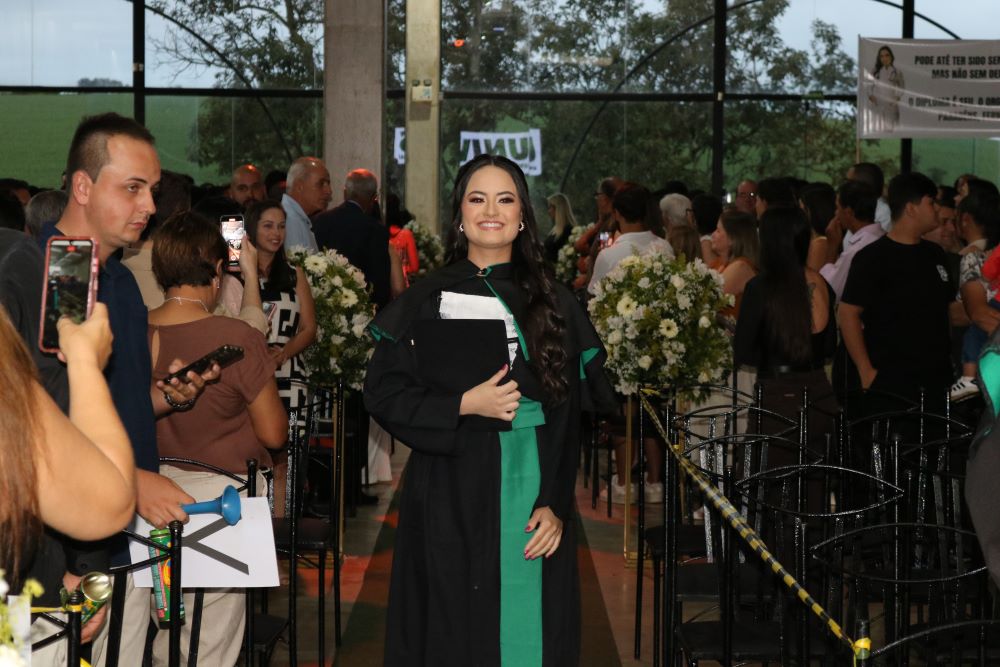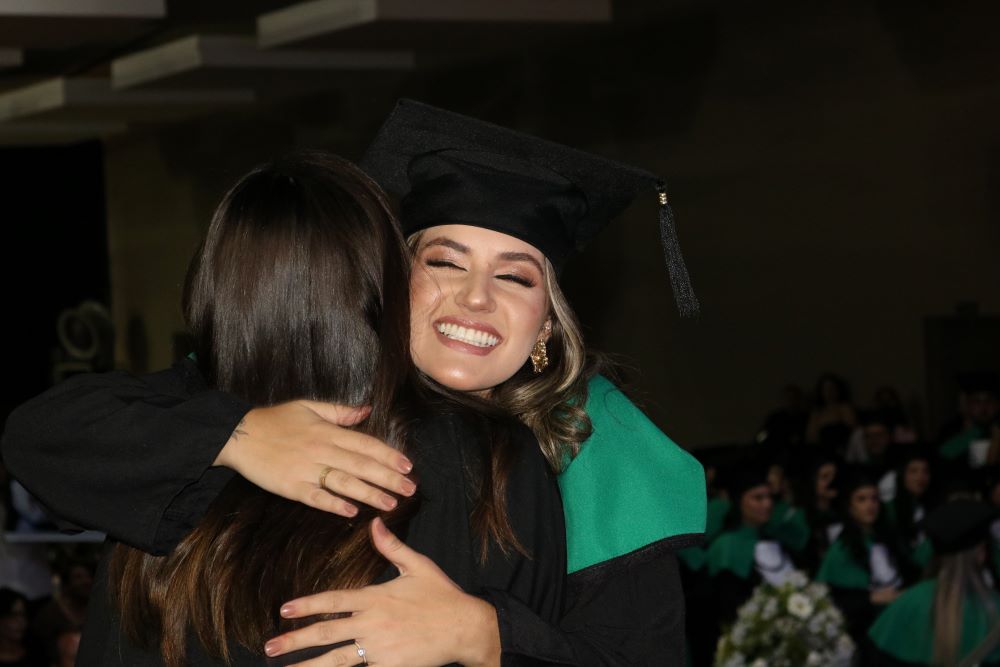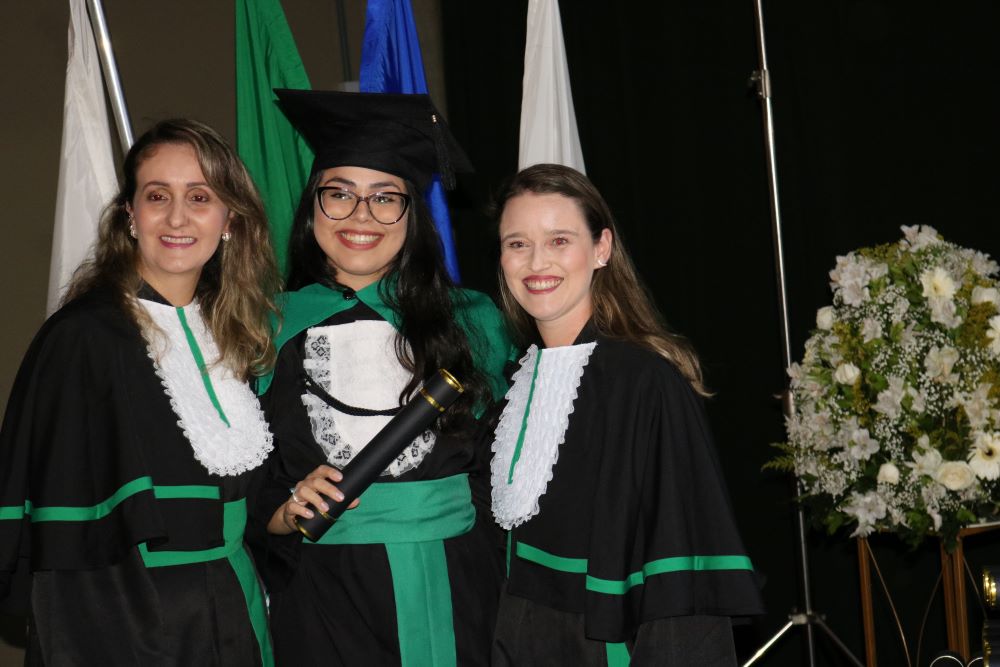 O formando Lucca de Almeida Rebello Toledo, representando os demais formandos do curso de Sistemas de Informação, recebeu das mãos do reitor o Grau Acadêmico. Em seguida, os formandos receberam os cumprimentos da mesa solene e posaram para as fotos individuais.