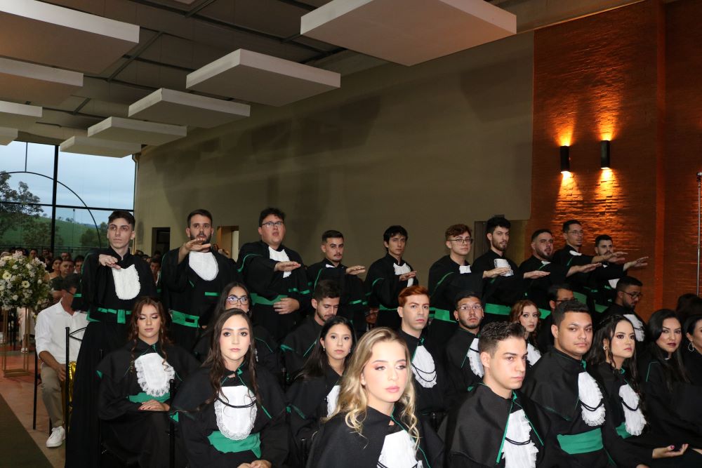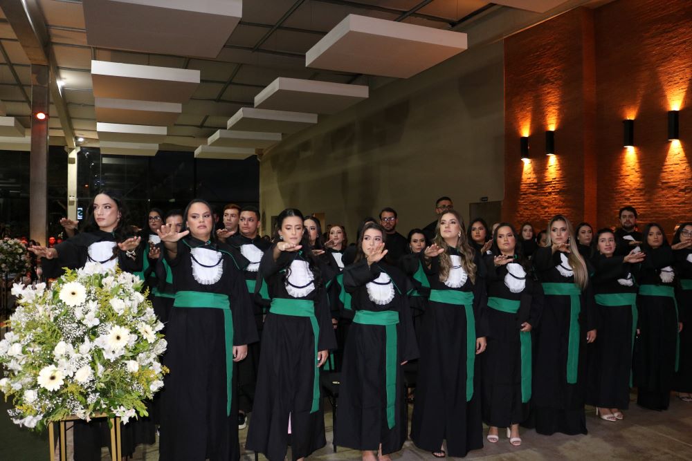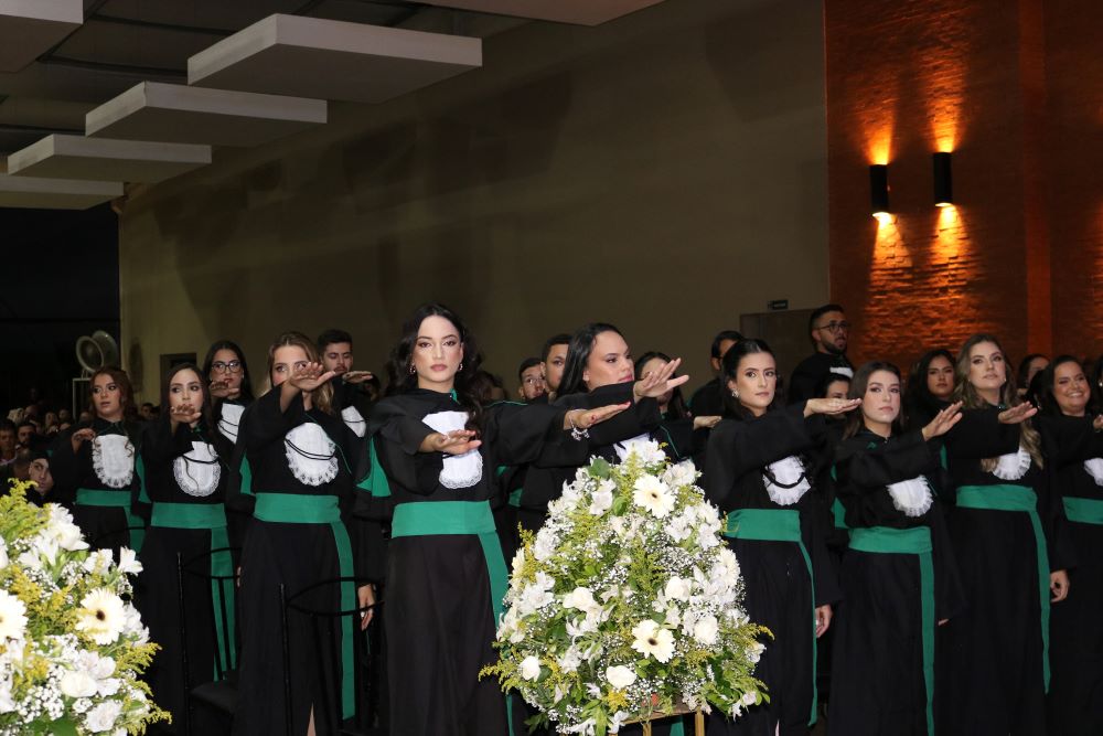 A formanda Laura Ladislau Alves proferiu o juramento em nome da turma de Enfermagem. “Solenemente, na presença de Deus e desta assembleia, juro: Dedicar minha vida profissional a serviço da humanidade, respeitando a dignidade e os direitos da pessoa humana, exercendo a enfermagem com consciência e fidelidade,guardar os segredos que forem confiados, respeitar o ser humano desde a concepção até depois da morte, não praticar atos que coloquem em risco a integridade física ou psíquica do ser humano, atuar junto à equipe de saúde para o alcance da melhoria do nível de vida da população, manter elevados os ideais de minha profissão, obedecendo os preceitos da ética, da legalidade e da moral, honrando seu prestígio e suas tradições. Assim, eu prometo”.