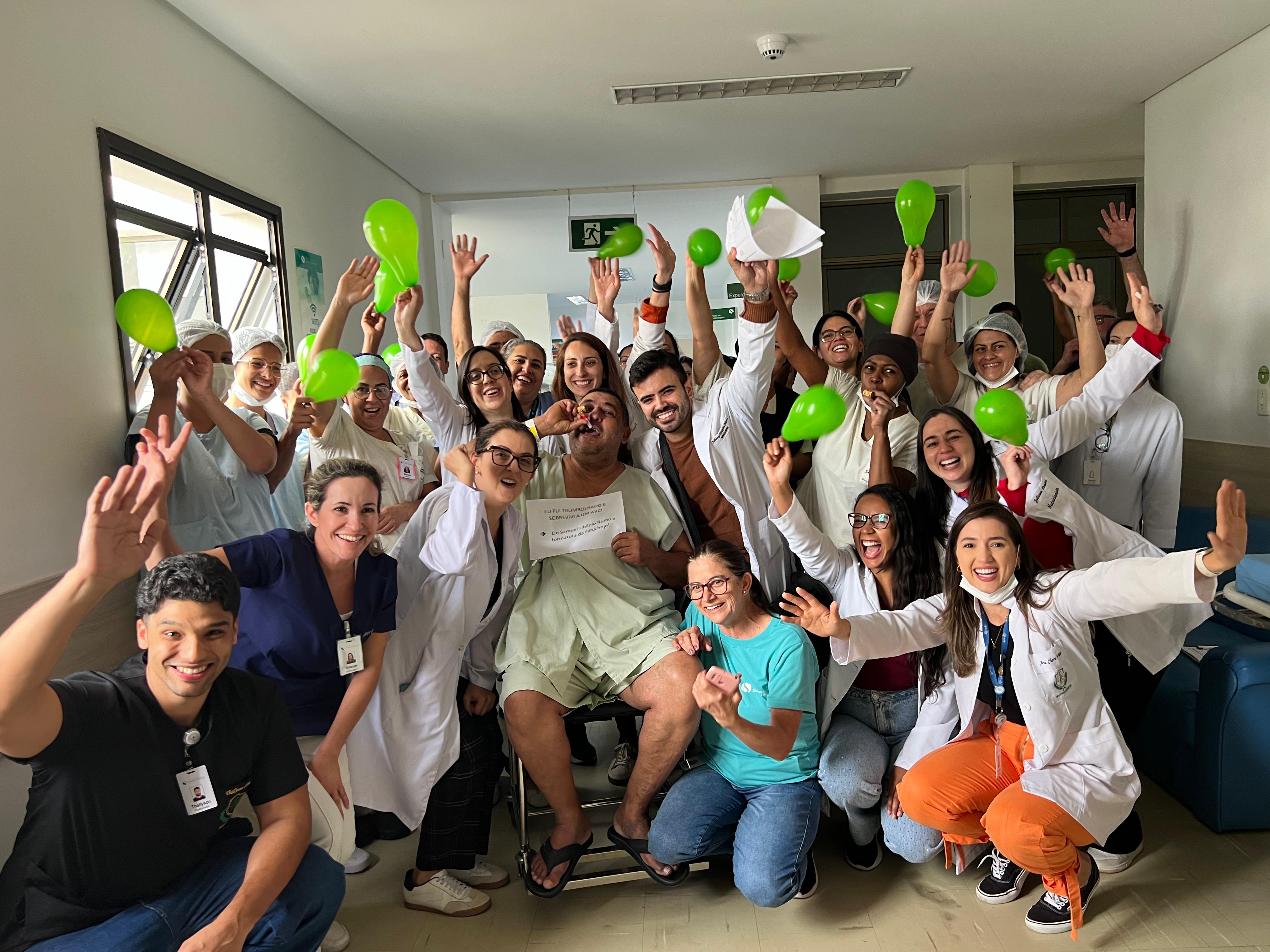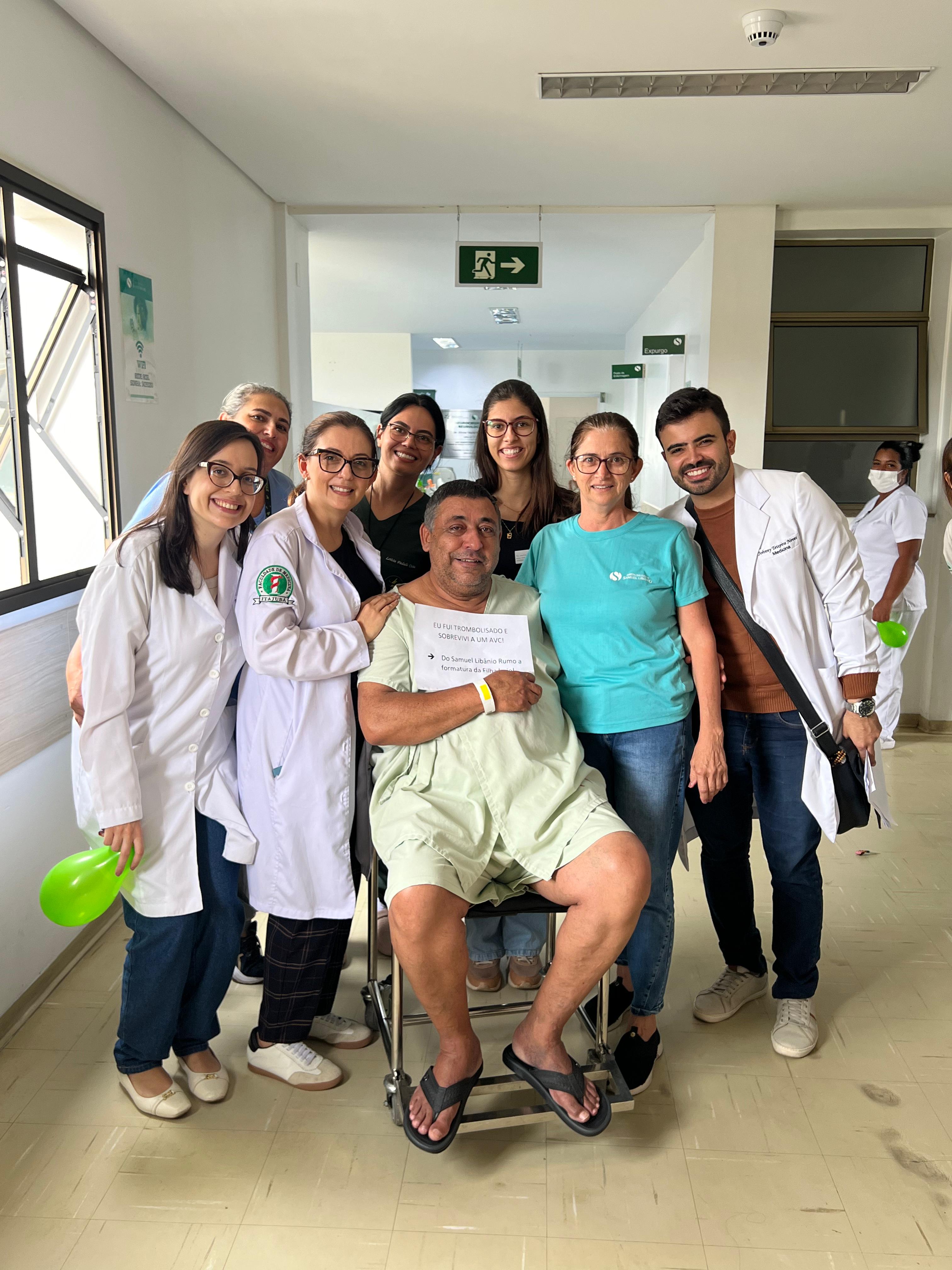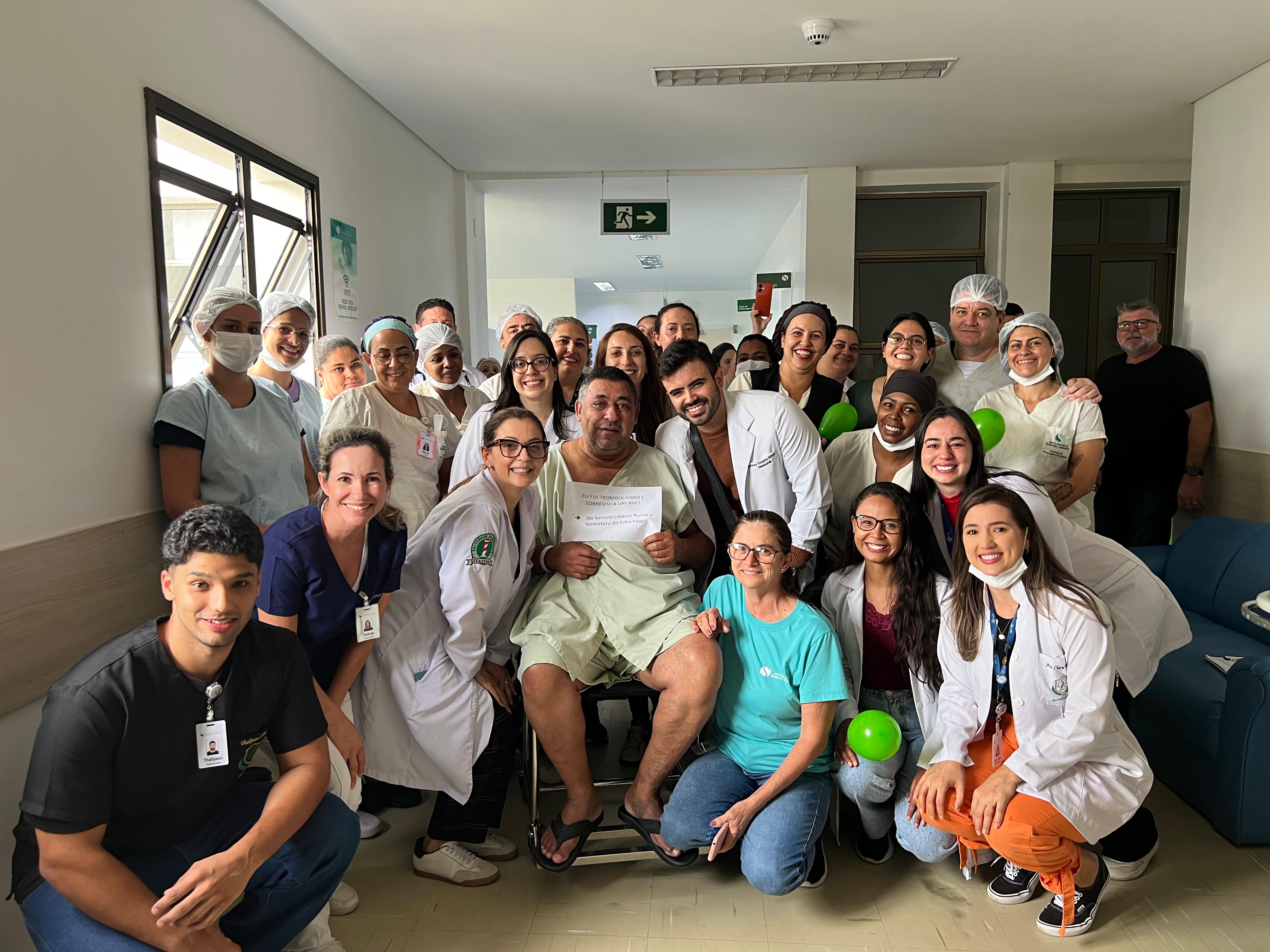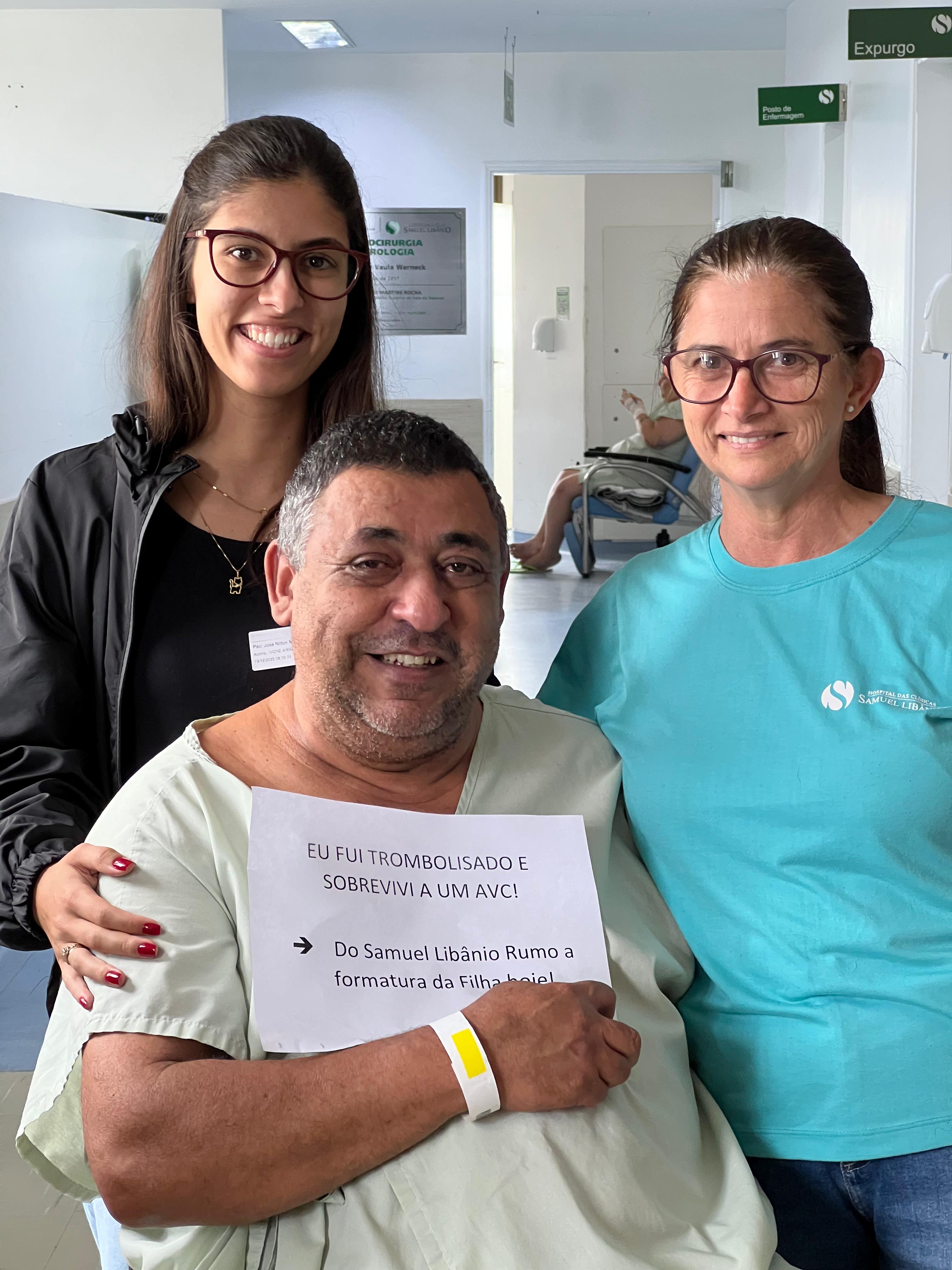 O funcionário José Nilton Marques Rezende do setor de Nutrição do Complexo Hospitalar Samuel Libânio teve alta nesta sexta-feira, dia 19 de dezembro, depois de um Acidente Vascular Cerebral (AVC) grave que se tornou mais uma história emocionante e de superação no CHSL. “É uma história de milagre, superação, mas também de competência e estrutura organizada. O AVC, que é uma causa importante de mortalidade, também pode deixar sequelas. Na segunda-feira, José teve um mal súbito, que foi categorizado como um AVC isquêmico e um AVC grave, que pegava uma região que era primordial para a sobrevivência. Nós conseguimos detectar a tempo, o Pronto Atendimento observou e chamou a equipe da Neurologia, fizemos a trombólise para dissolver coágulos sanguíneos bloqueiam vasos, restaurando o fluxo sanguíneo, e conseguimos levá-lo para a UTI. Durante a UTI, ele teve uma reperfusão daquela área, ele regrediu todos os sintomas que vinha apresentando na admissão. Foi um trabalho muito bonito de ver da equipe da intensiva, do pessoal do pronto-entendimento, da equipe da neurologia, pessoal da fonoaudiologia, todos que tiveram envolvidos. Uma coisa que chamou atenção é que durante o momento da trombólise, durante a admissão do pronto-socorro, ele estava todo alegre, brincalhão, e durante a UTI ele ficou um pouco mais ansioso, começou a chorar. Quando a gente questionou o motivo, é porque ele ia ter uma formatura da filha, hoje, e ele lutou muito pra conseguir isso, e não sabia se ele iria conseguir estar presente. Então pra nós, além de ser um milagre, graças a todas as pessoas envolvidas, é um presente pra filha dele poder dançar a valsa com o pai”, contam os médicos Johnny Neves e Carla Tostes.