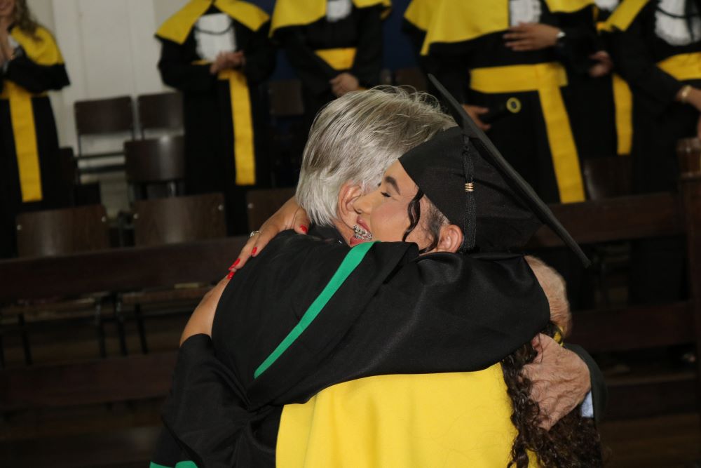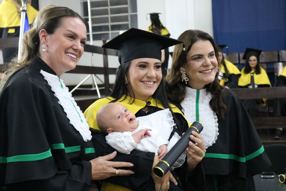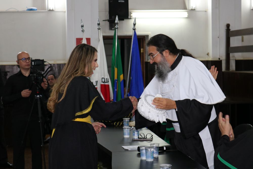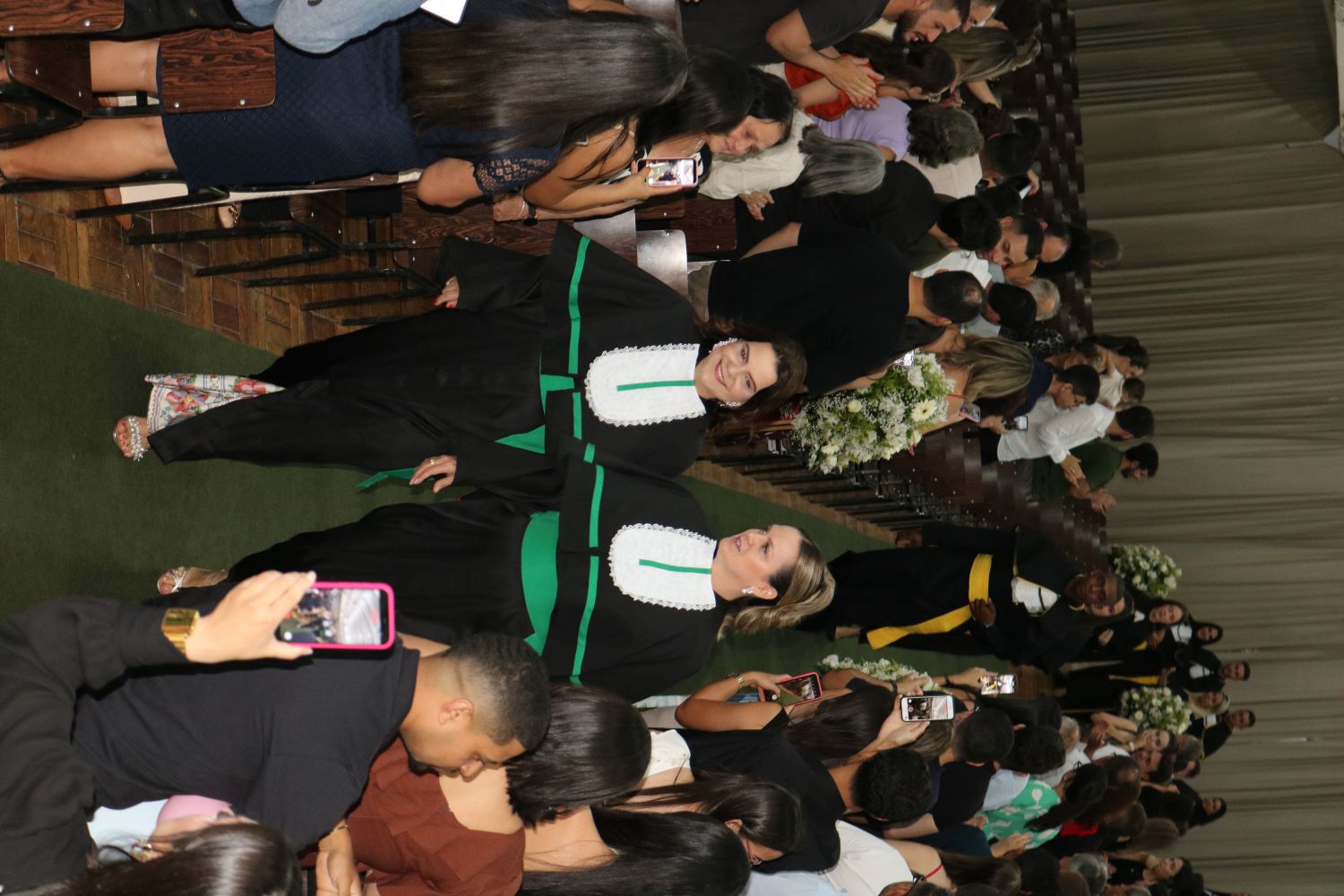 A acadêmica Sandy Rosa Melo Franco, representando os demais formandos do curso de Farmácia, recebeu das mãos do reitor da Univás, o Grau Acadêmico de Farmacêutico. Em seguida, os formandos receberam os cumprimentos da mesa solene e posaram para as fotos individuais.