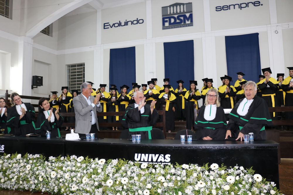 O reitor da Univás José Dias da Silva Neto propiciou um dos momentos mais emocionates da solenidade quando pediu para que os criadores do curso de Farmácia da Univás, Pythágoras e Ana, ficassem em pé para serem ovacionados com uma grande salva de palmas cheia de emoção e gratidão.