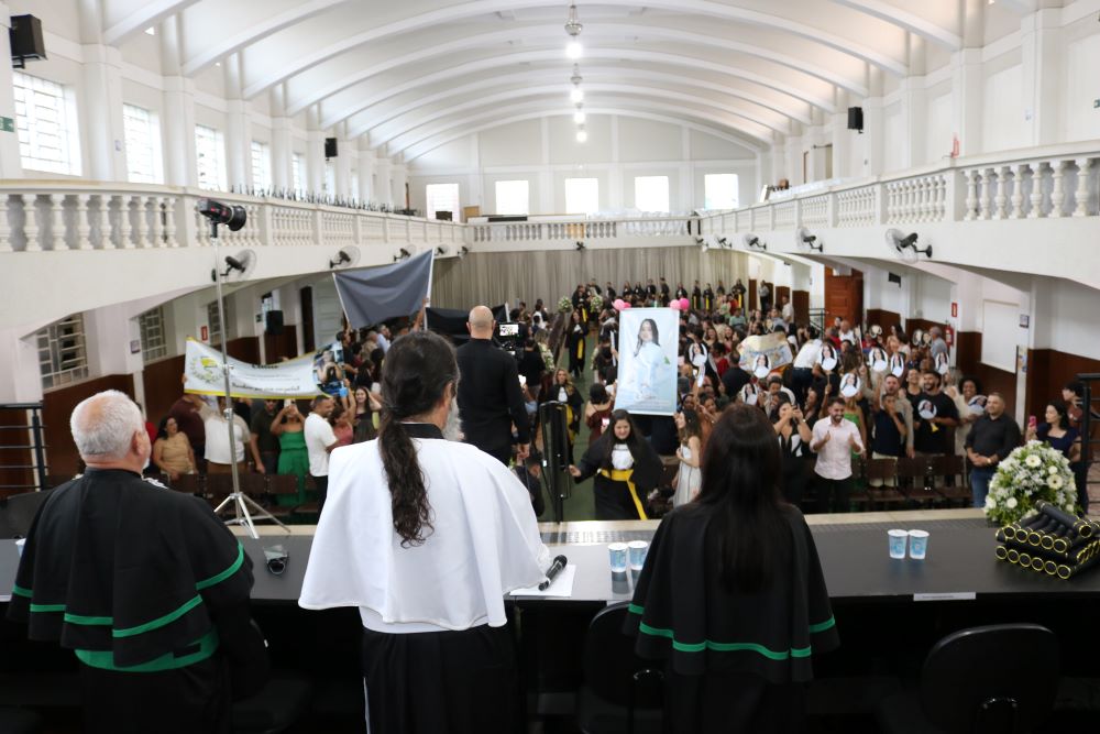 A formanda Leticya de Almeida Sales proferiu o juramento em nome da turma de Farmácia. “Prometo que, ao exercer a profissão de Farmacêutico, mostrar-me-ei sempre fiel aos preceitos da honestidade, da caridade e da ciência. Nunca me servirei da profissão para corromper os costumes ou favorecer o crime. Se eu cumprir este juramento com fidelidade, gozem, para sempre, a minha vida e a minha arte, de boa reputação entre os homens. Se dele me afastar ou infringí-lo, suceda-me o contrário. Assim, prometo”.