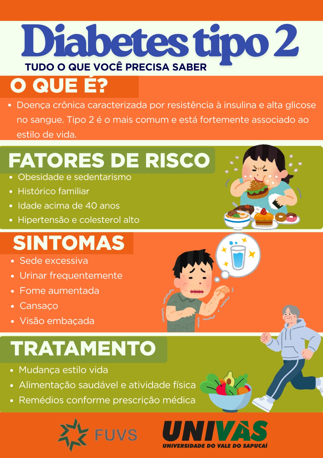 A subturma G do 4º ano do curso de Medicina da Univás está desenvolvendo um projeto de conscientização que possui o objetivo de alertar a população sobre a importância de cuidar da saúde, adotar hábitos de vida mais saudáveis e reforçar o acompanhamento adequado para pessoas que já convivem com o Diabetes Mellitus tipo 2. O projeto está sob a orientação do professor Dr. Augusto Castelli Von Atzingen, da disciplina de Curricularização de Extensão do módulo de Clínica 2.