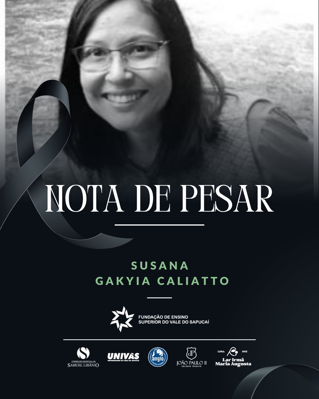 A Fundação de Ensino Superior do Vale do Sapucaí (FUVS), juntamente com suas unidades mantidas, lamenta profundamente o falecimento da ex-professora da Pós-Graduação da Universidade do Vale do Sapucaí (Univás), Susana Gakyia Caliatto.