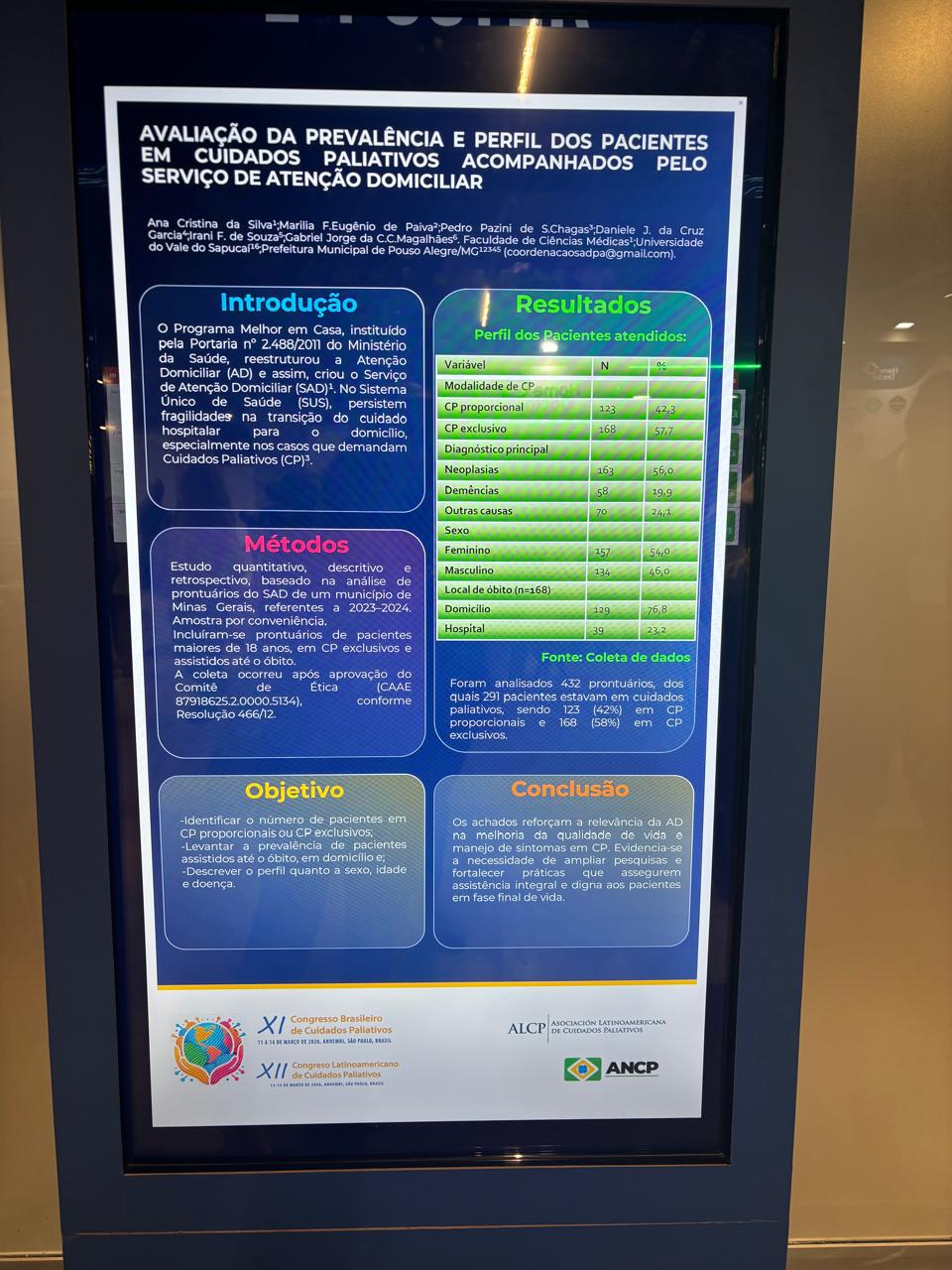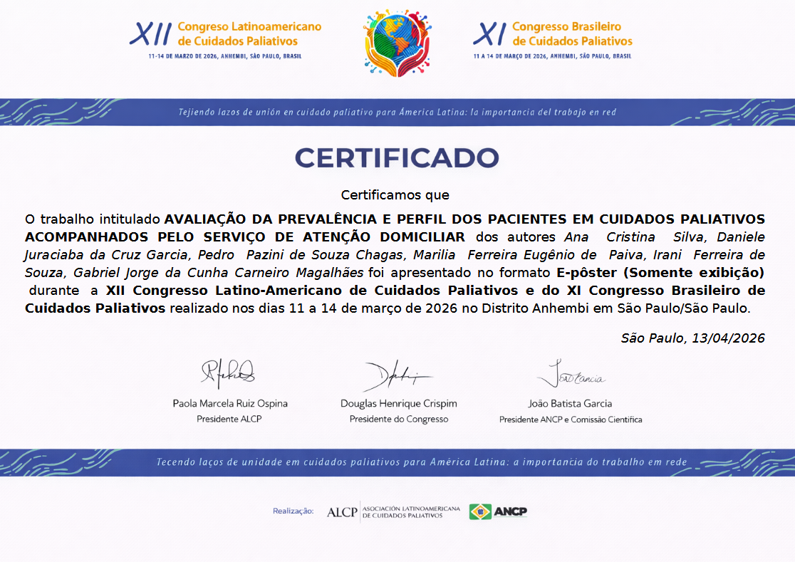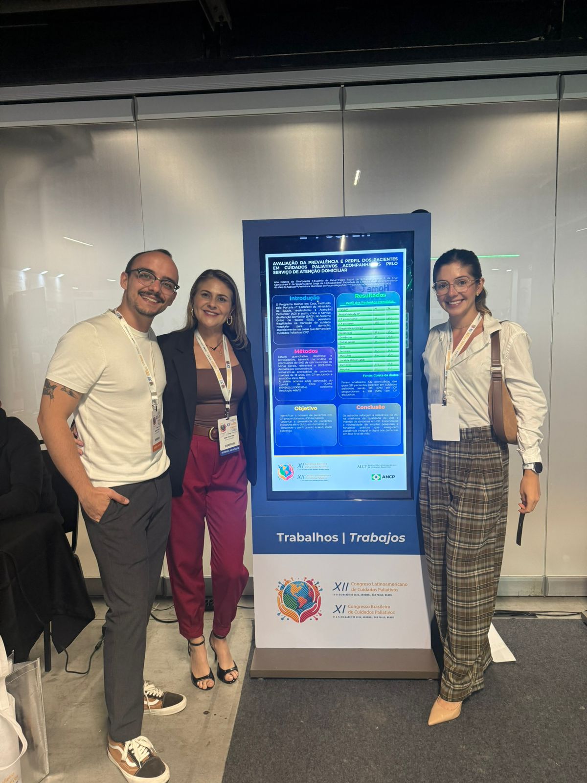 O trabalho intitulado “Avaliação da prevalência e perfil dos pacientes em cuidados paliativos acompanhados pelo Serviço de Atenção Domiciliar” foi apresentado no formato E-pôster, reunindo importantes contribuições para a compreensão do perfil de pacientes acompanhados em domicílio, com foco na qualificação da assistência e no fortalecimento da atenção integral.