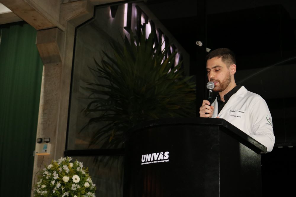 O orador Guilherme Augusto Carvalho Camanducaia falou em nome dos concluintes de Residência Médica e Especialização Médica 2026. “Ao longo desses anos, não vivenciamos apenas um treinamento técnico. Foi um processo de amadurecimento. Foi o período em que o conhecimento deixou de ser teoria e passou a ter nome, rosto, história, família, paciente. Aqui aprendemos que a medicina é muito maior do que protocolos e diretrizes. Um dos maiores aprendizados da residência: é entender que a medicina não é sobre perfeição. É sobre compromisso. É sobre responsabilidade contínua”, afirmou Guilherme Camanducaia.