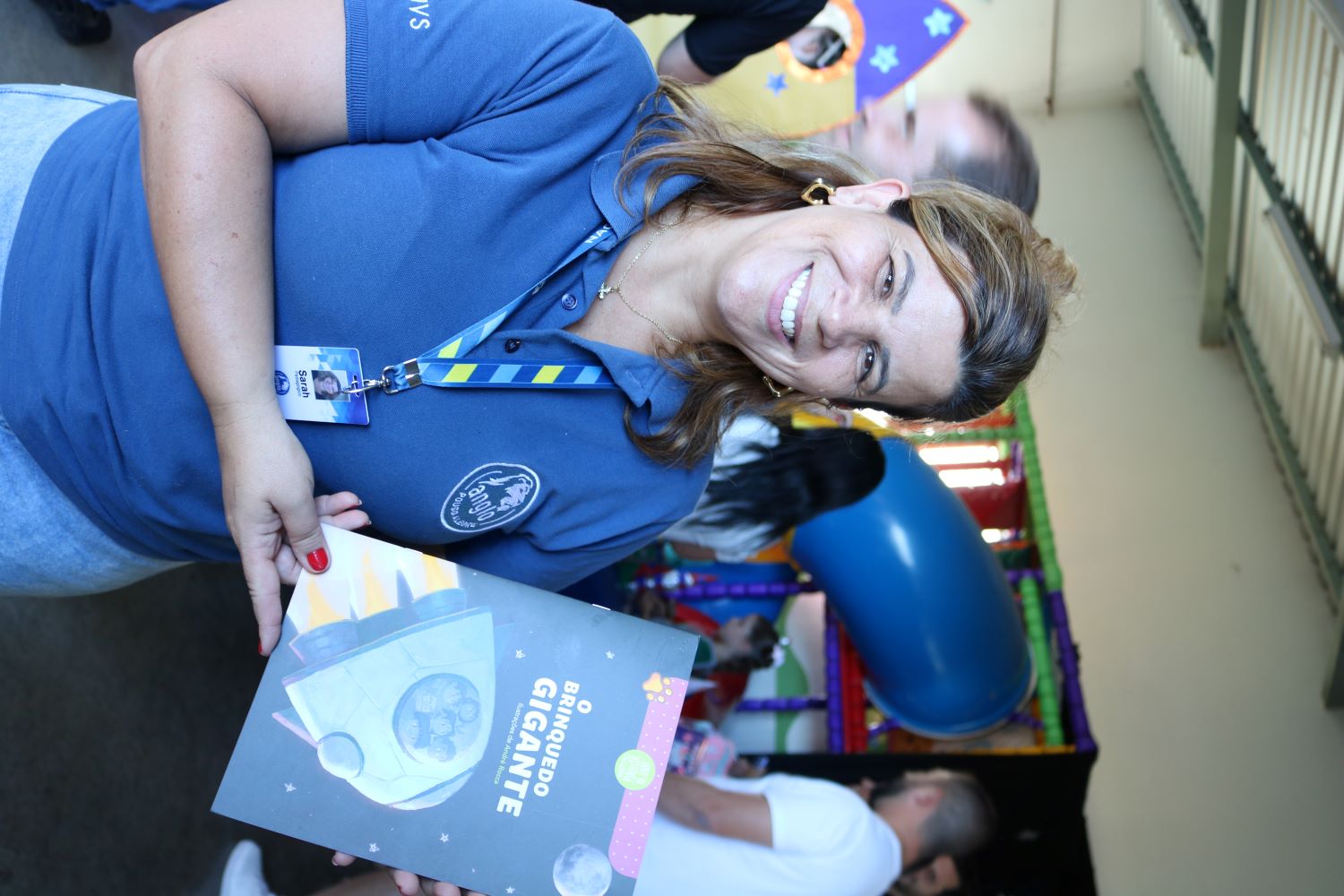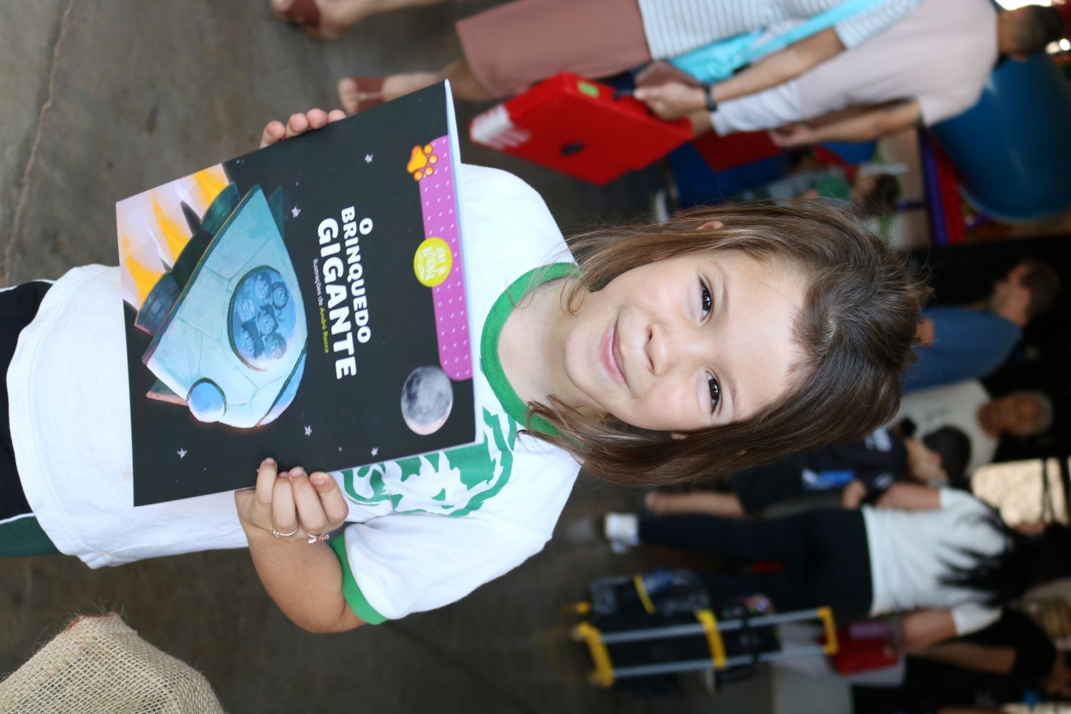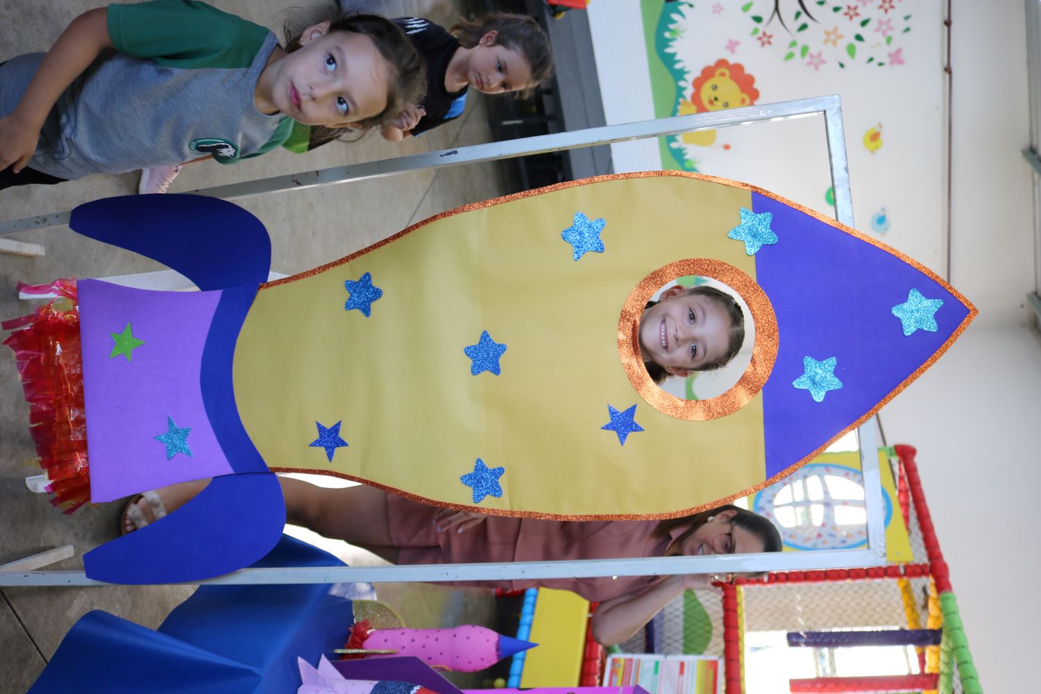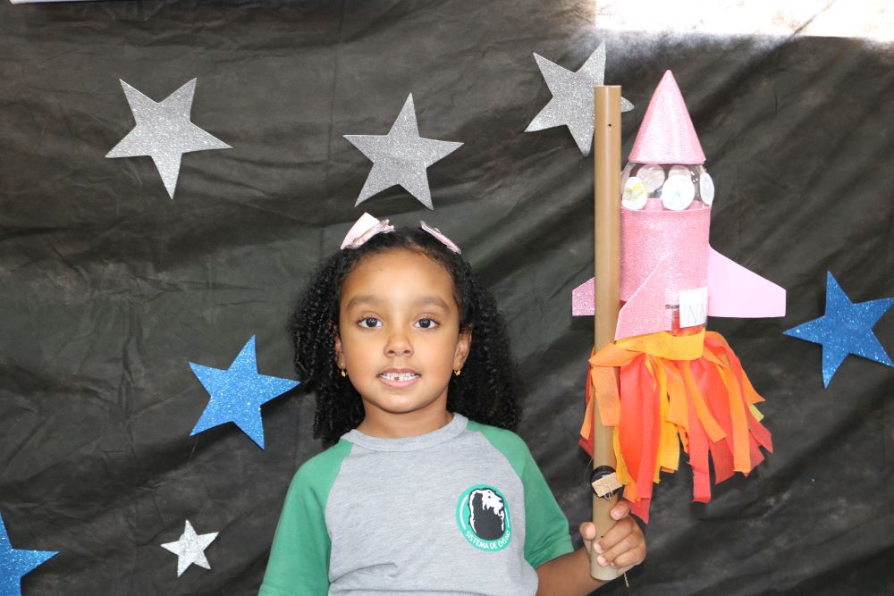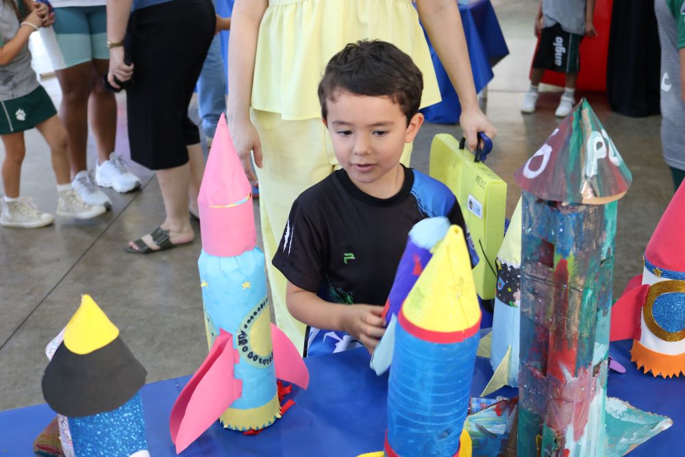 A coordenadora da Educação Infantil, Sarah Augusta Andrade de Carvalho Souza, explica que o livro "O Brinquedo Gigante" estimula a imaginação e a criatividade. “A história foca em um brinquedo especial, frequentemente descrito como uma máquina ou um brinquedo grande, que permite às crianças sonharem e recriarem cenários lúdicos. Nossos alunos descobriram a formação do solo terrestre, construíram os nomes dos planetas com jogos e letras móveis e finalizaram essa experiência com essa exposição linda de foguetes”, conta.
