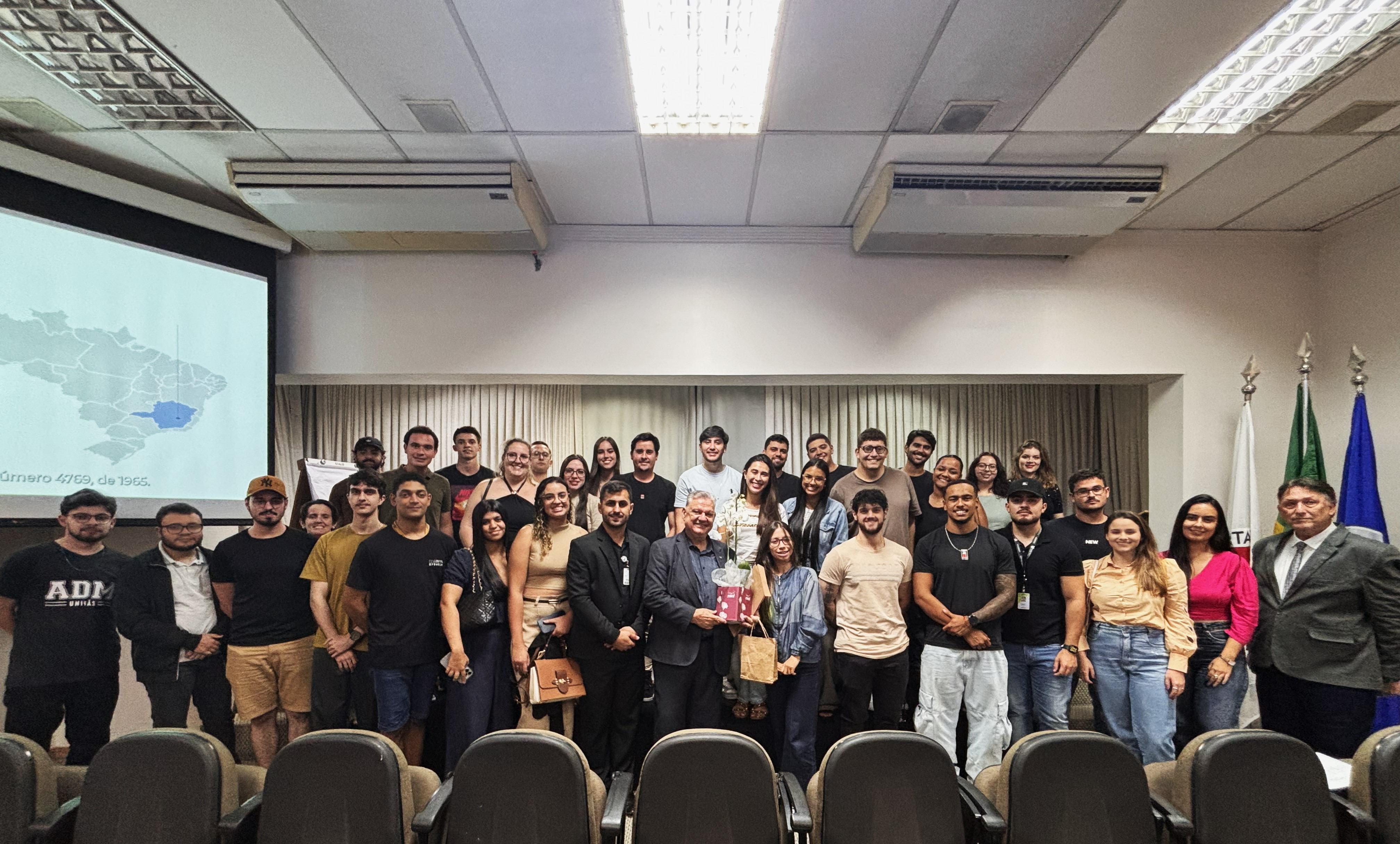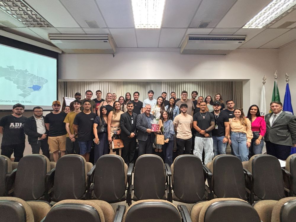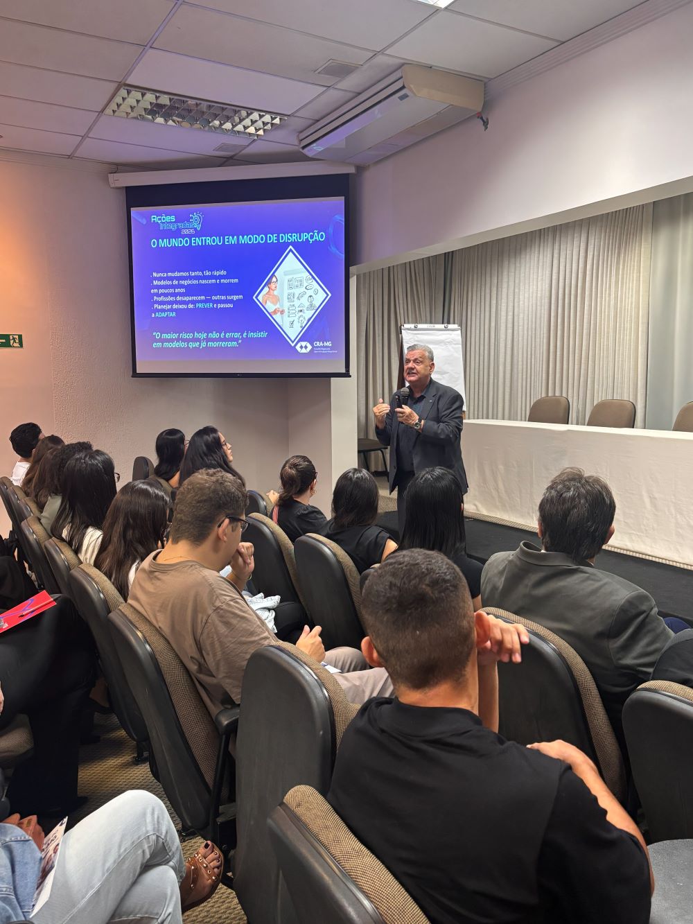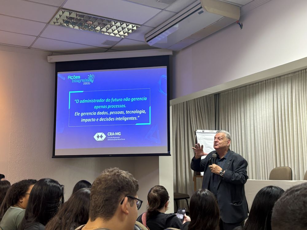 O palestrante foi o administrador Jehu Pinto de Aguilar Filho, presidente do CRAMG, que destacou a importância da integração entre o capital humano, as inovações tecnológicas e o foco em resultados como pilares essenciais para uma administração eficiente e alinhada às exigências do mercado atual. Ele também ressaltou a importância do Conselho Regional de Administração dentro das universidades, destacando seu papel na orientação, valorização e fortalecimento da profissão.
