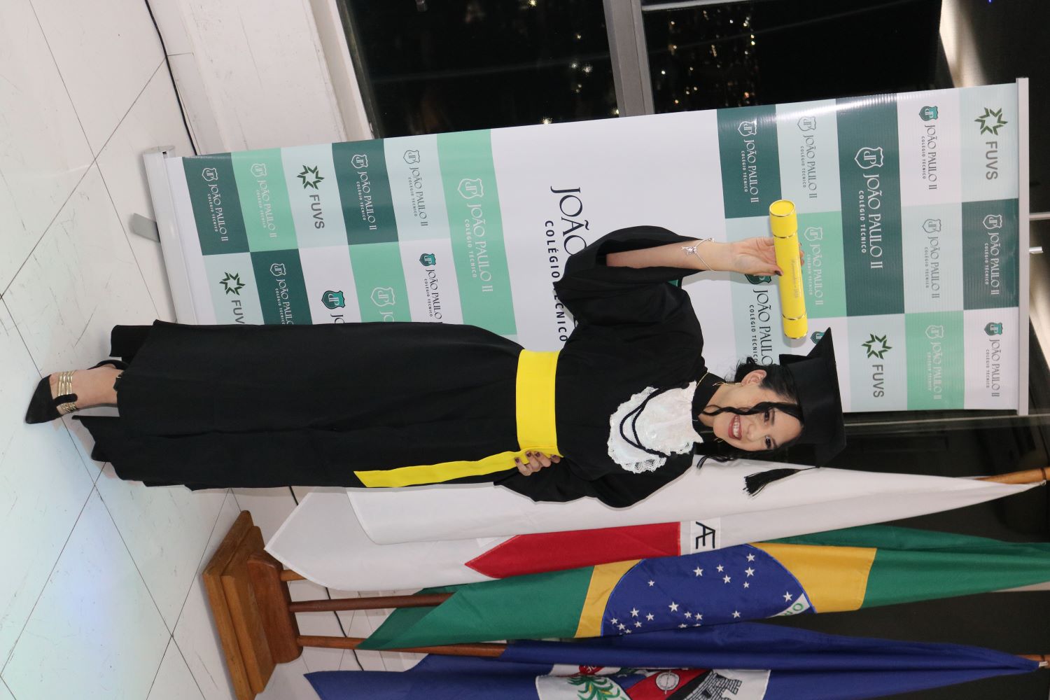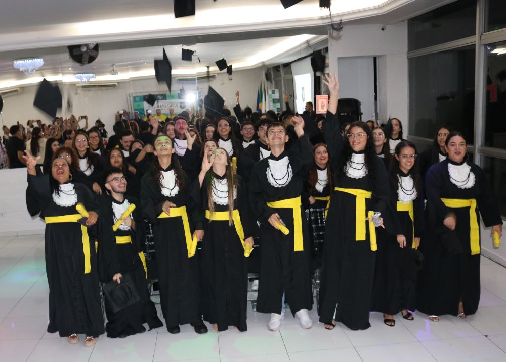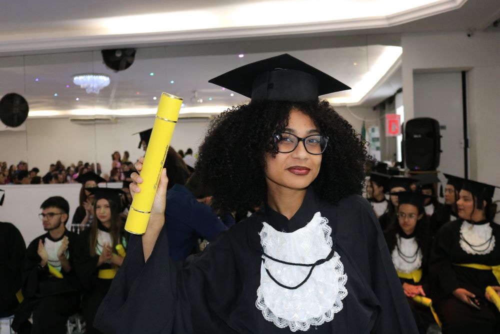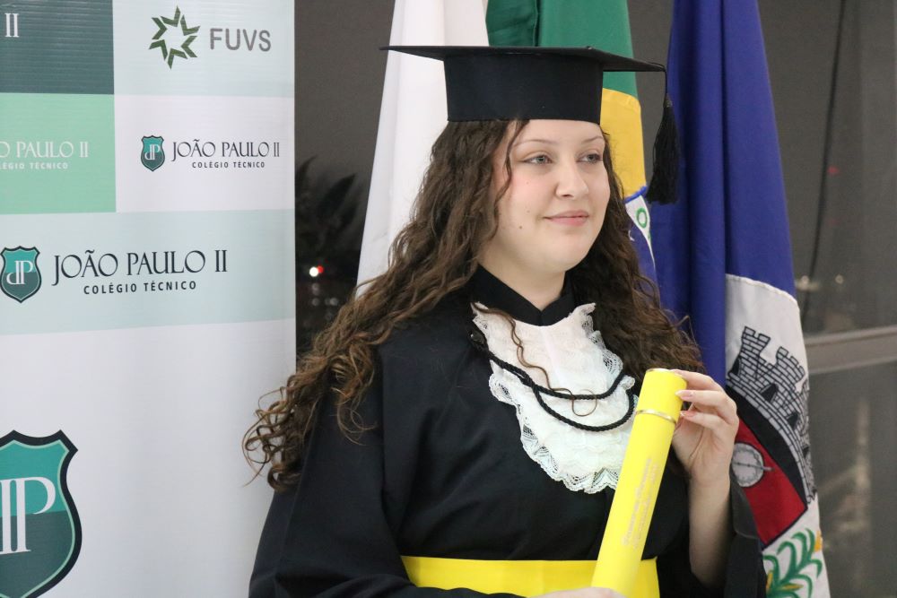 A oradora da turma, Rebeca Vitória Silva Rocha, em nome dos colegas do curso Técnico em Farmácia, agradeceu a todos pela vitória alcançada. “Não recebemos apenas um diploma. Mais do que isso, recebemos uma missão. A missão de continuar aprendendo, de evoluir constantemente, de exercer nossa profissão com ética, responsabilidade e empatia, de nunca esquecer que, atrás de cada receita, existe uma pessoa. Uma história, uma preocupação, uma esperança. Que sejamos profissionais competentes, mas também humanos. Que sejamos aqueles técnicos que explicam com paciência, que orientam com cuidado e que honram o jaleco que vestem. Que nunca percamos a essência que nos trouxe até aqui”, discursou.