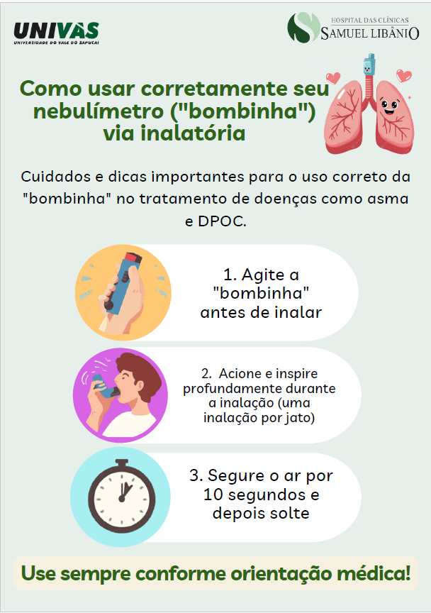 Segundo a acadêmica, o objetivo foi promover educação em saúde de forma acessível e prática. Para isso, elas elaboraram materiais informativos em formato de panfletos, que foram distribuídos nos ambulatórios de Pneumologia do Complexo Hospitalar Samuel Libânio (CHSL). Durante as consultas, também as alunas fizeram orientações diretas aos pacientes, explicando passo a passo o uso correto das medicações inalatórias.